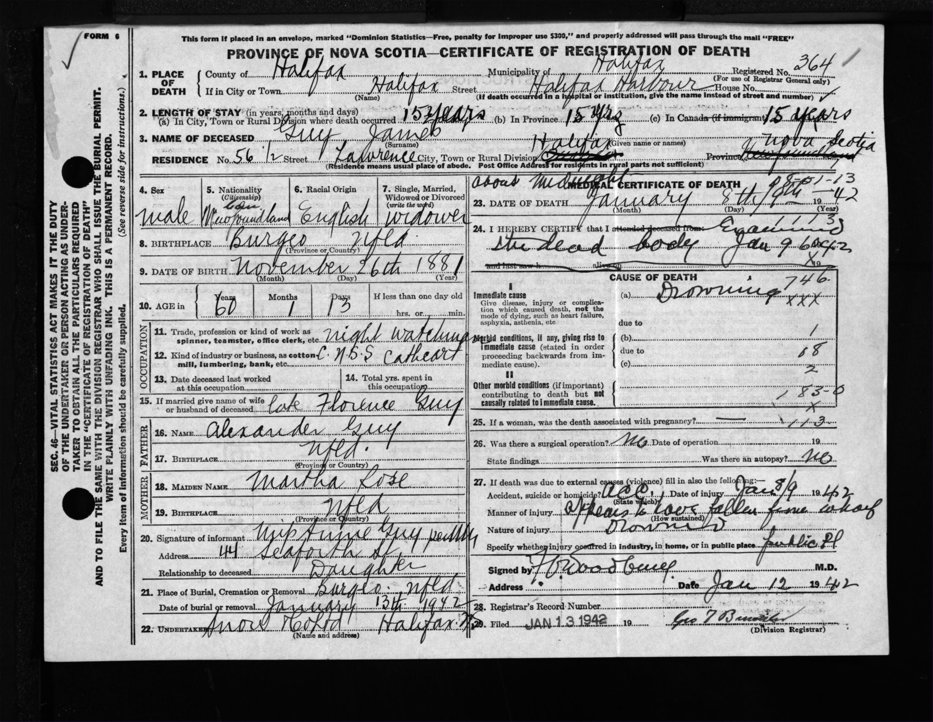 Male Death Registration: Year: 1942 file: 201 number: 364