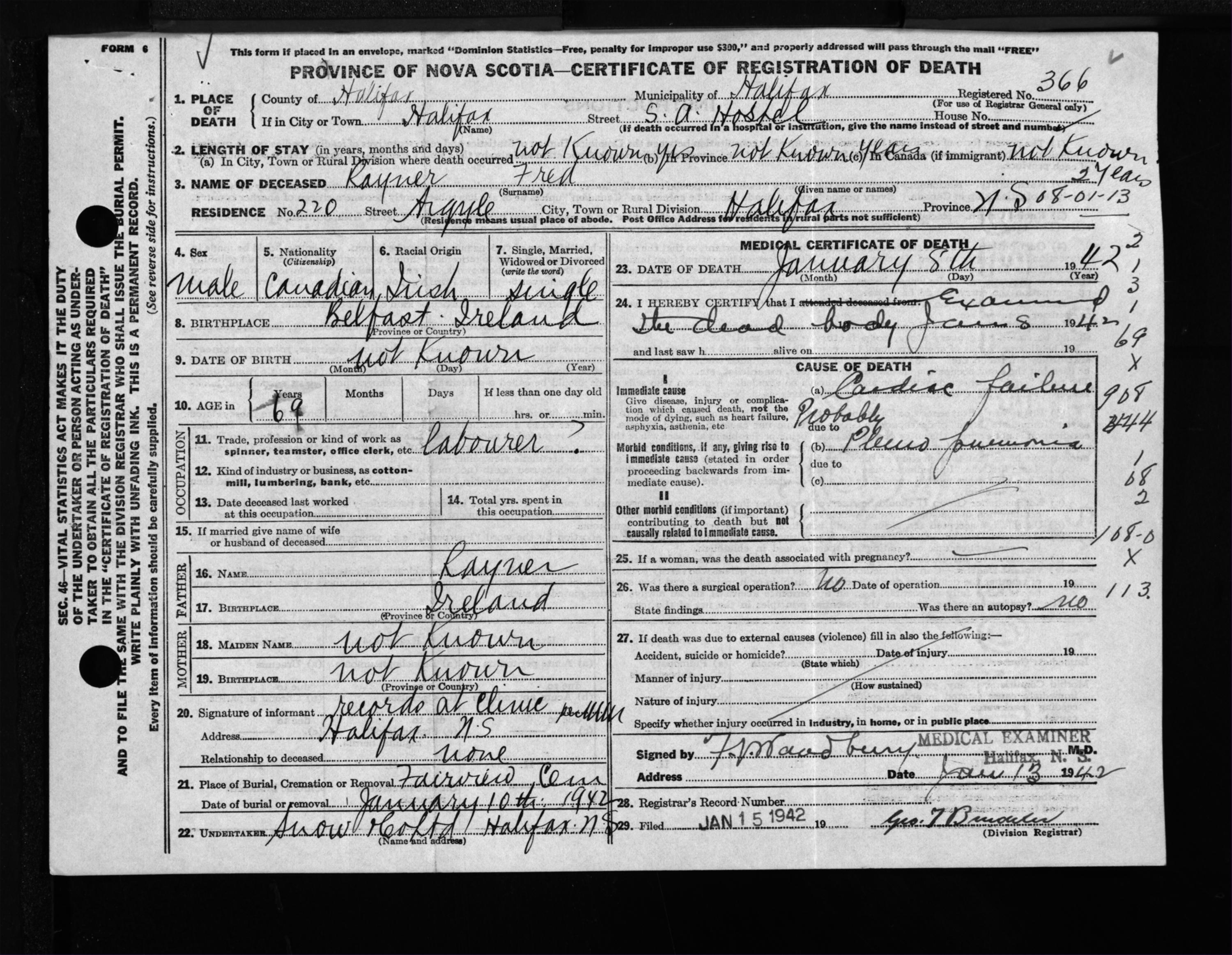 Male Death Registration: Year: 1942 file: 201 number: 366