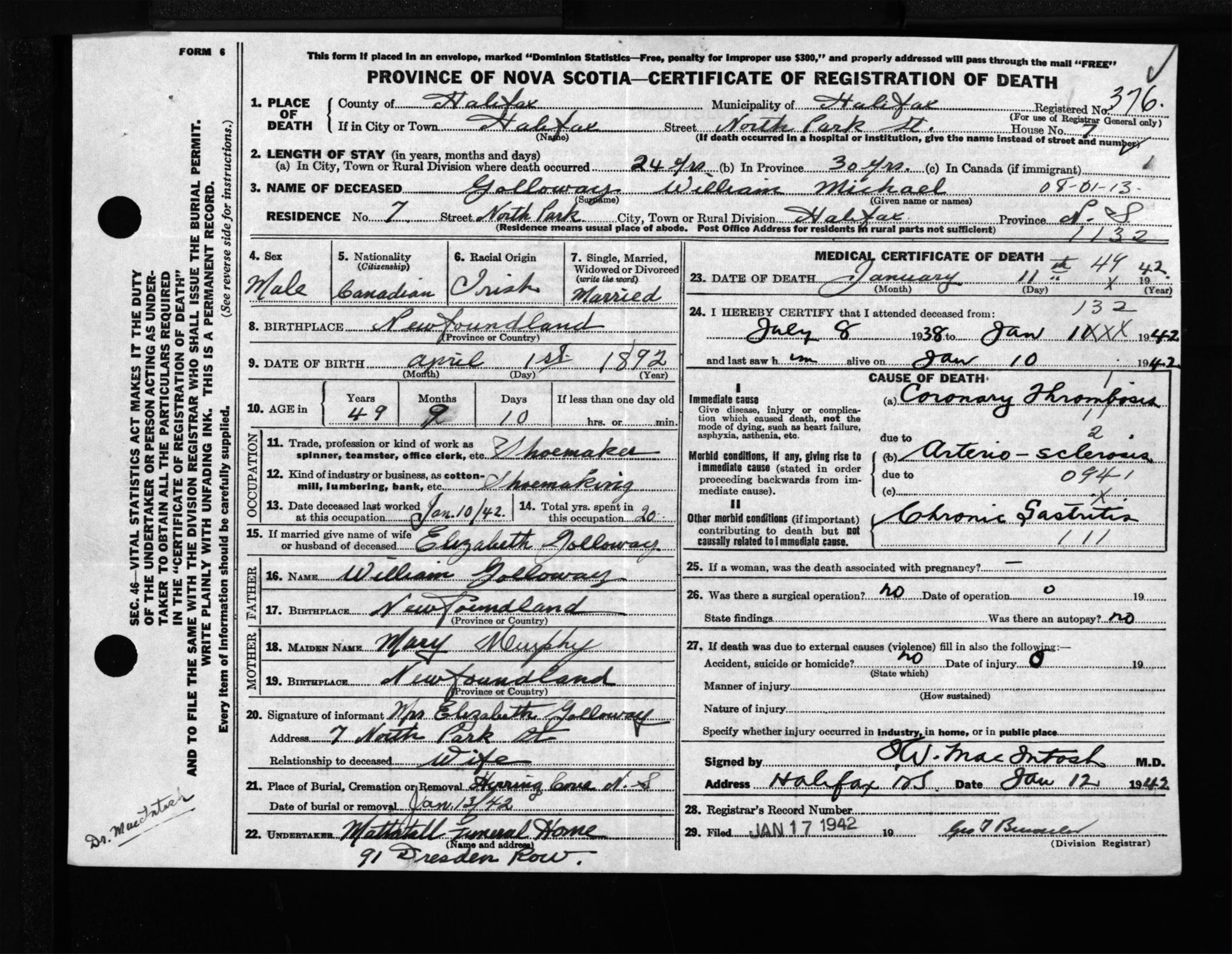 Male Death Registration: Year: 1942 file: 201 number: 376