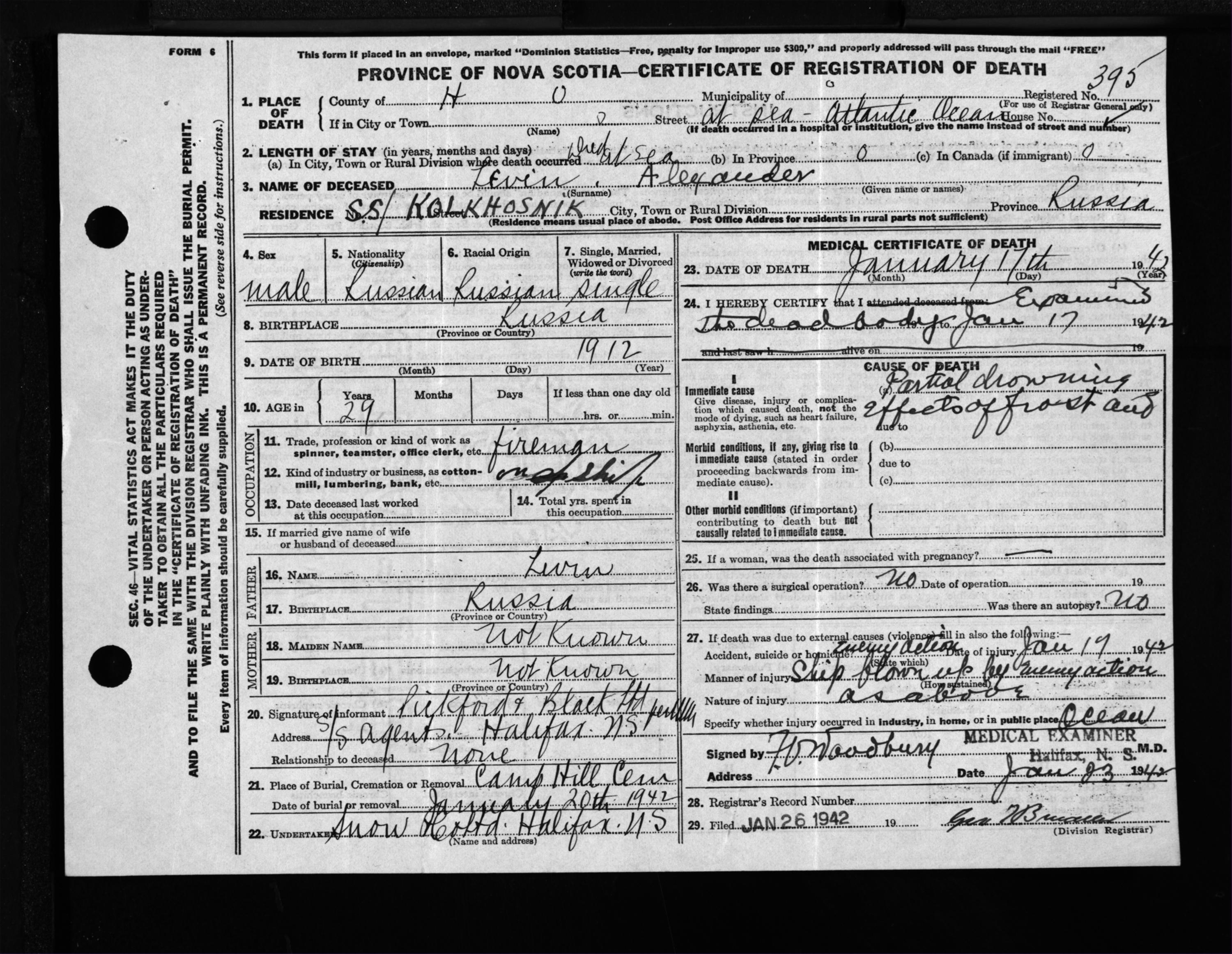 Male Death Registration: Year: 1942 file: 201 number: 395