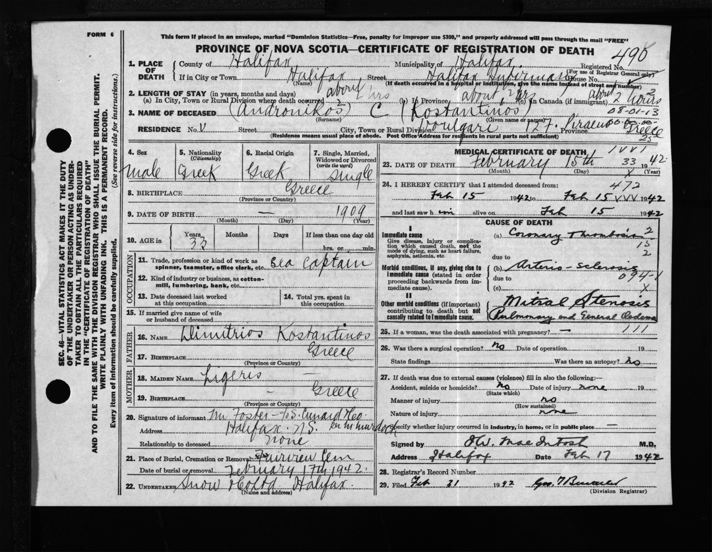 Male Death Registration: Year: 1942 file: 201 number: 490