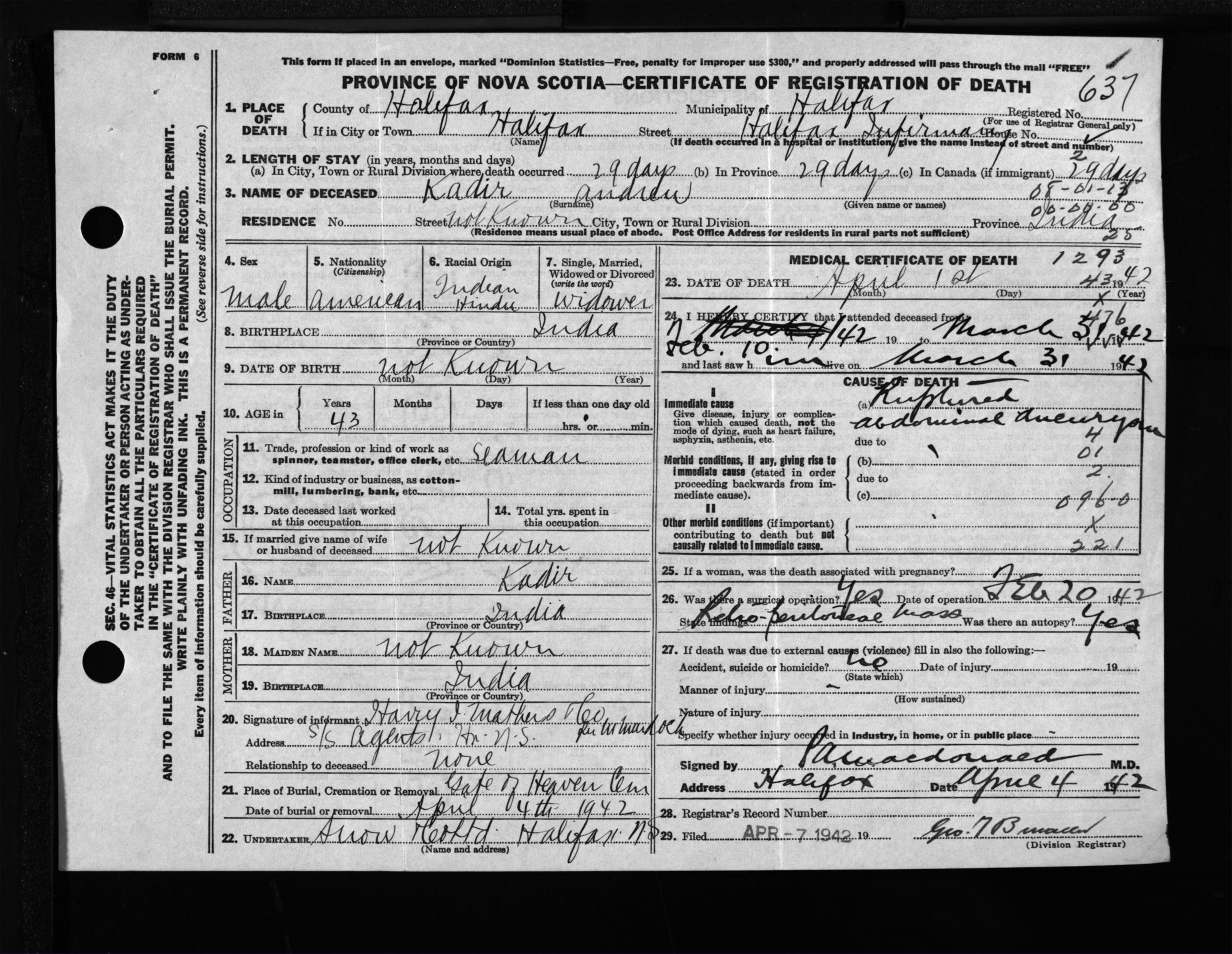 Male Death Registration: Year: 1942 file: 201 number: 637