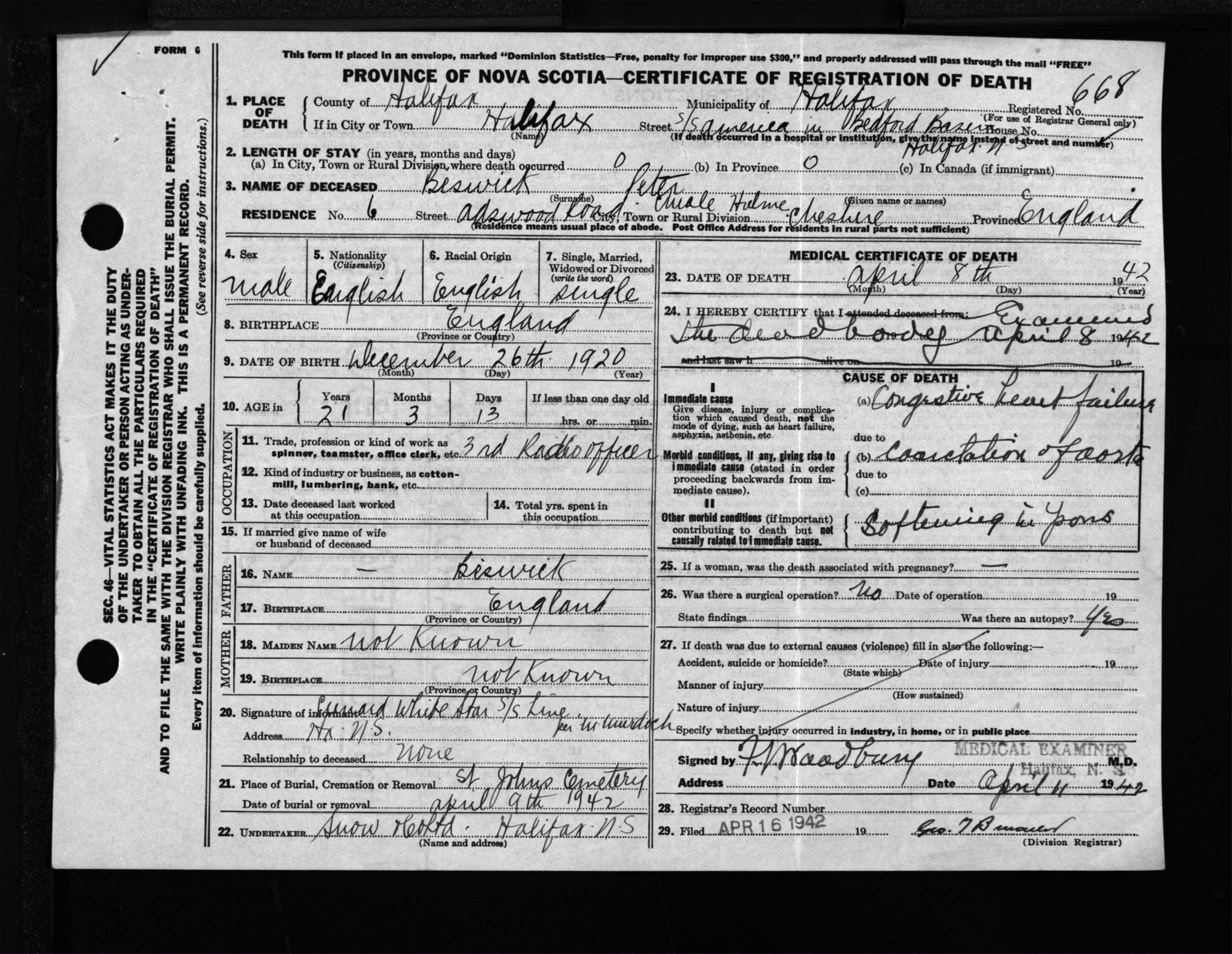 Male Death Registration: Year: 1942 file: 201 number: 668