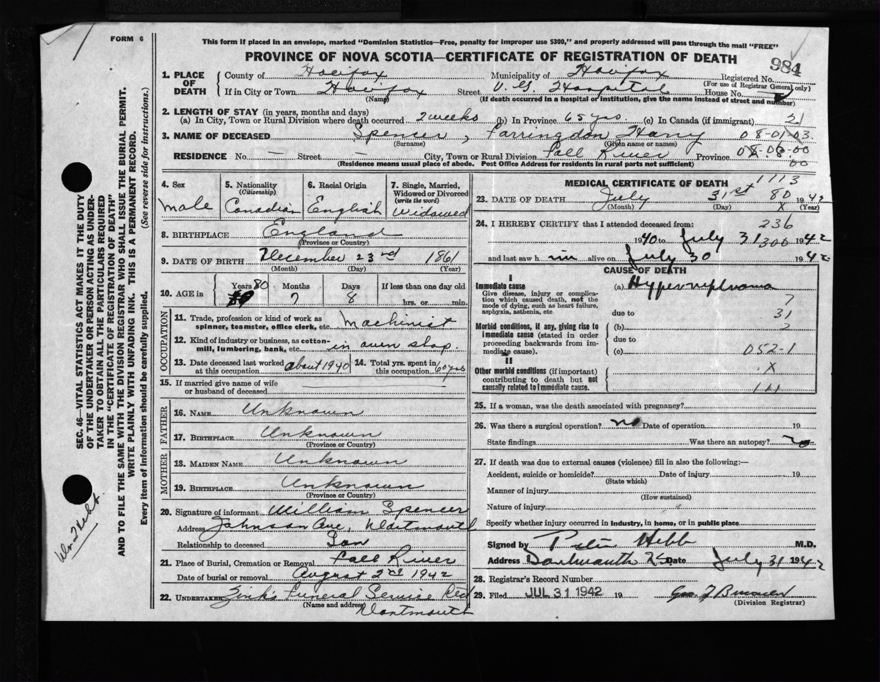 Male Death Registration: Year: 1942 file: 201 number: 984