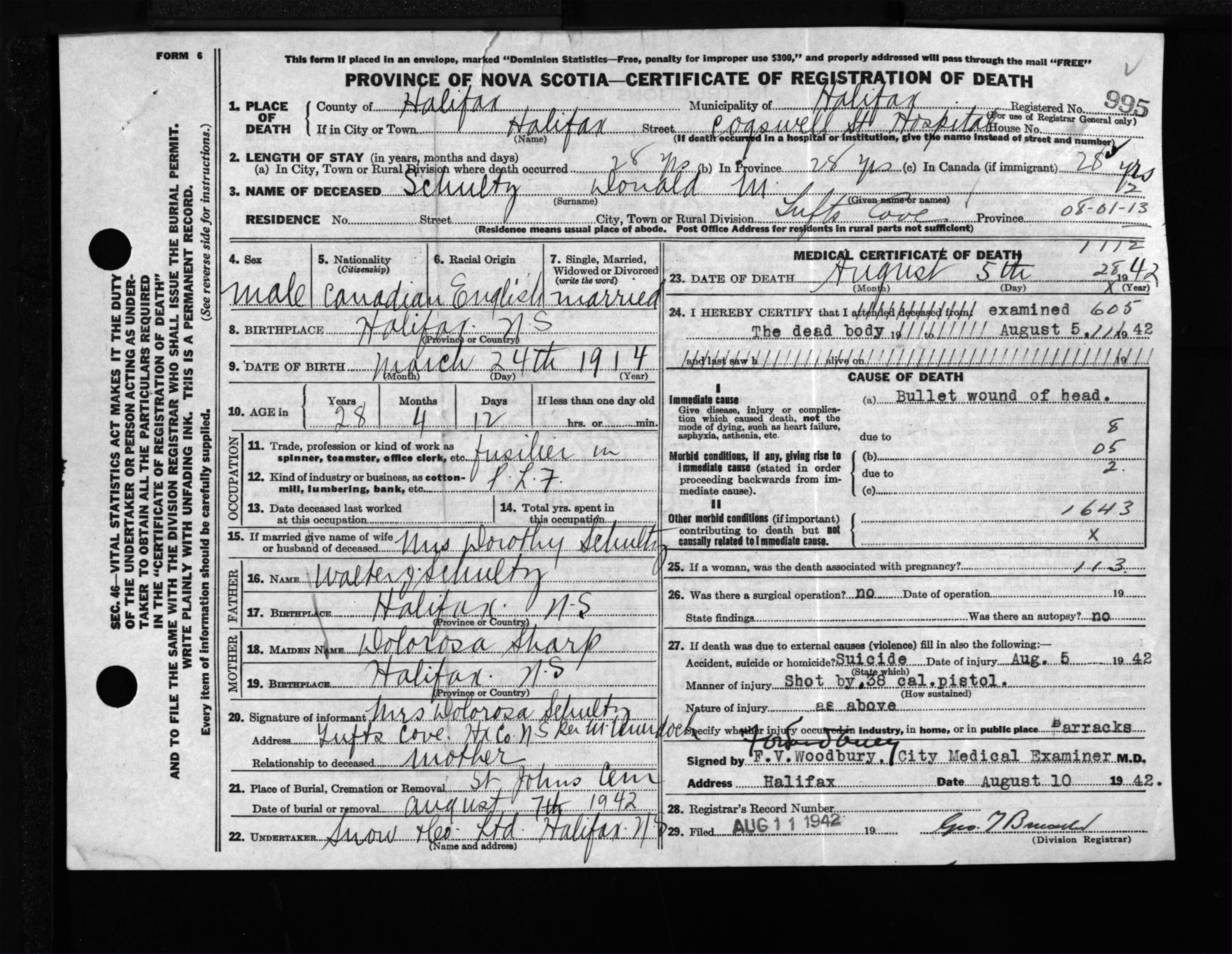 Male Death Registration: Year: 1942 file: 201 number: 995