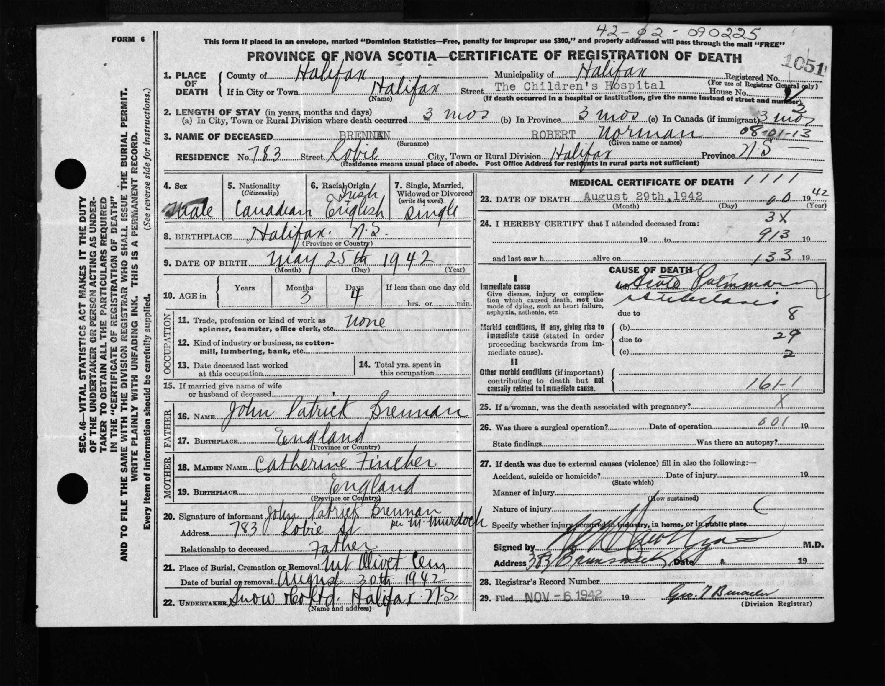 Male Death Registration: Year: 1942 file: 201 number: 1051