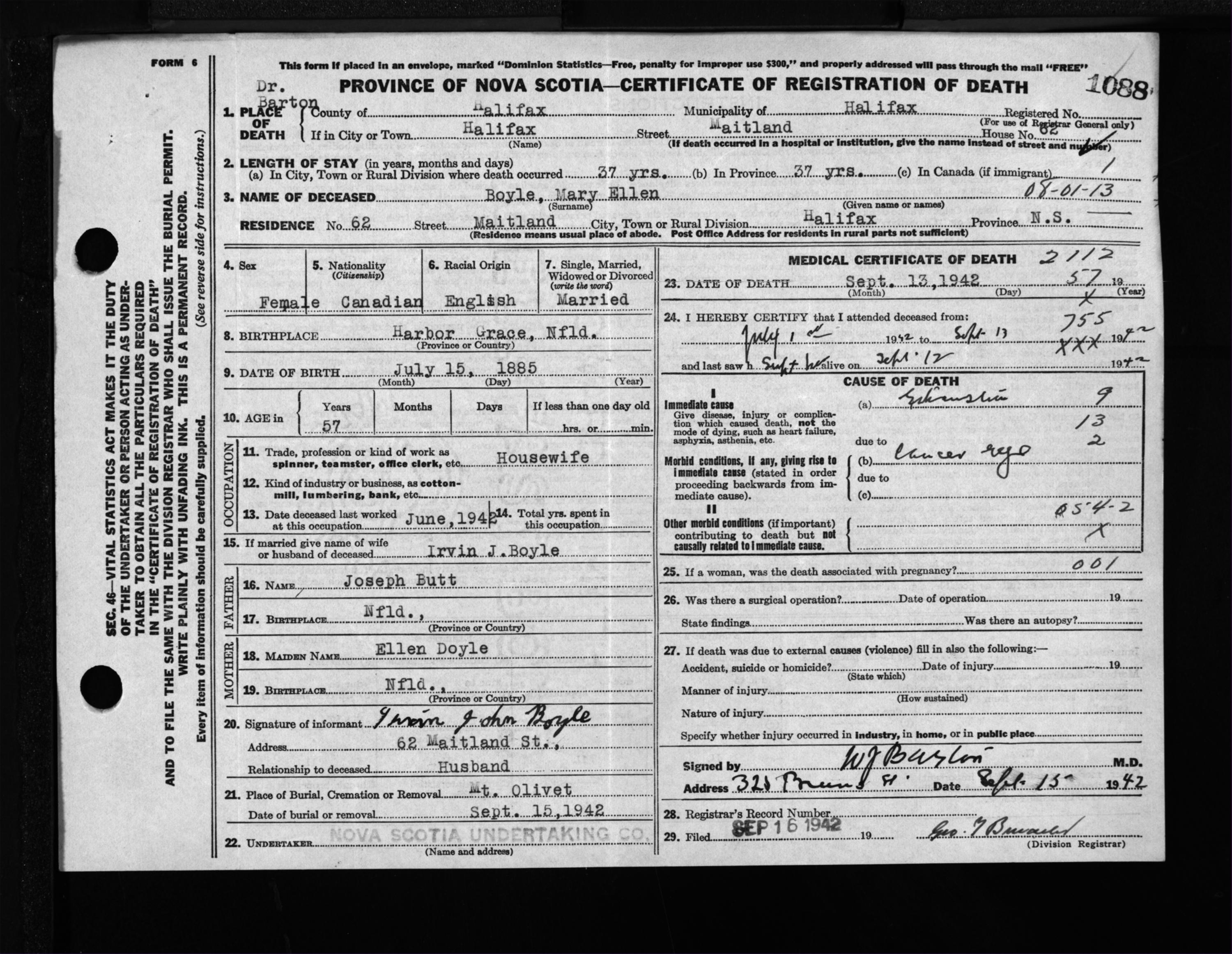 Female Death Registration: Year: 1942 file: 201 number: 1088
