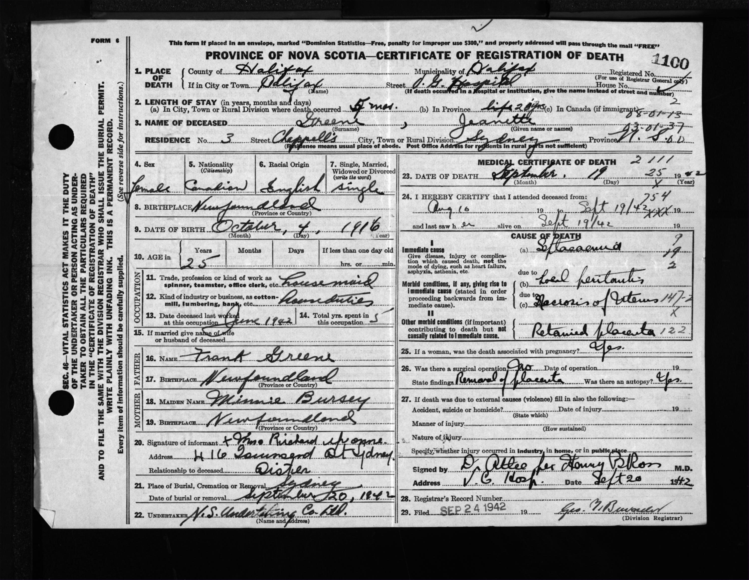 Female Death Registration: Year: 1942 file: 201 number: 1100