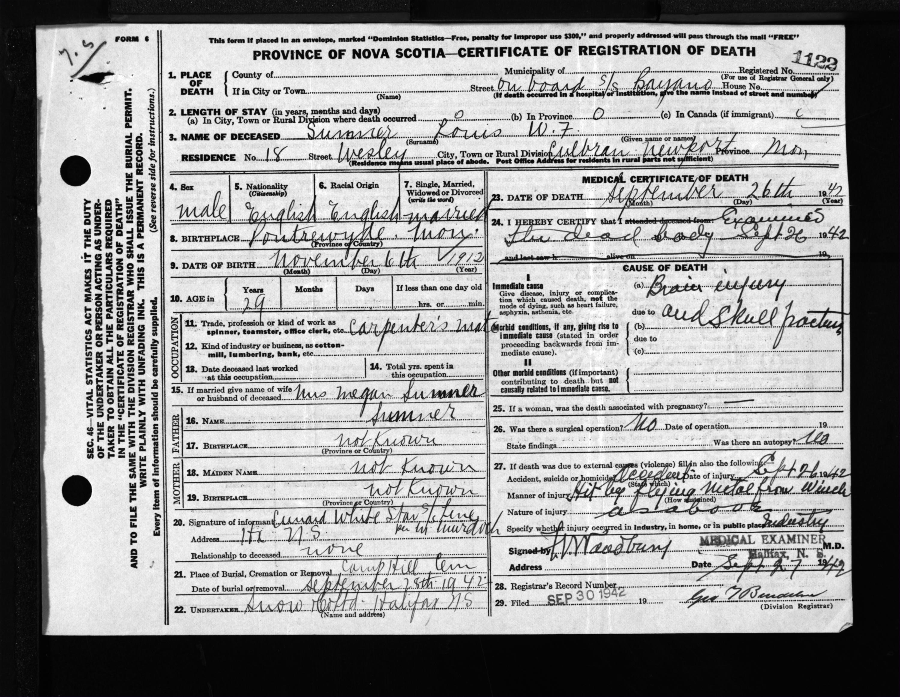 Male Death Registration: Year: 1942 file: 201 number: 1122