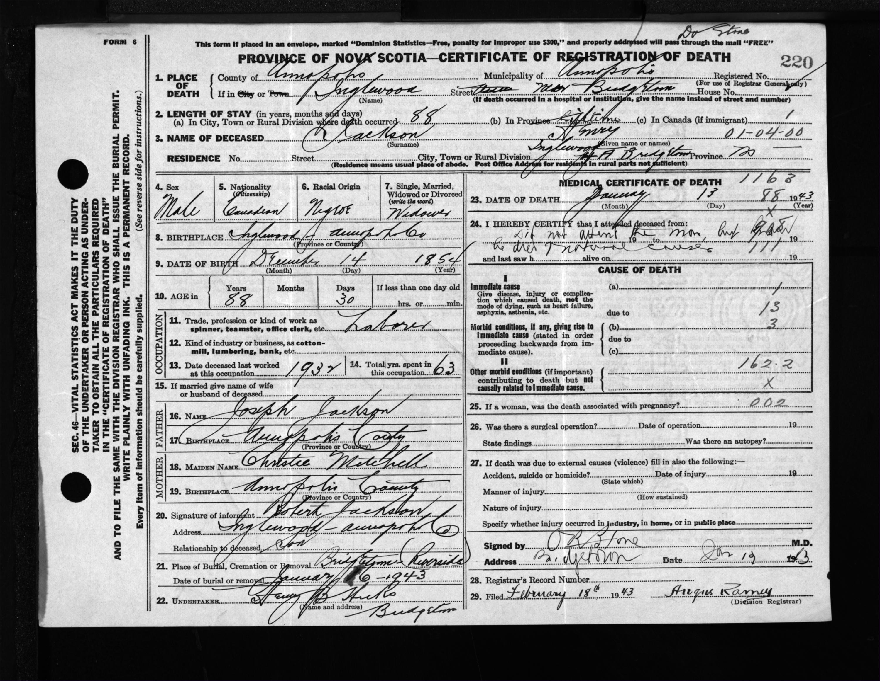 Male Death Registration: Year: 1943 file: 202 number: 220