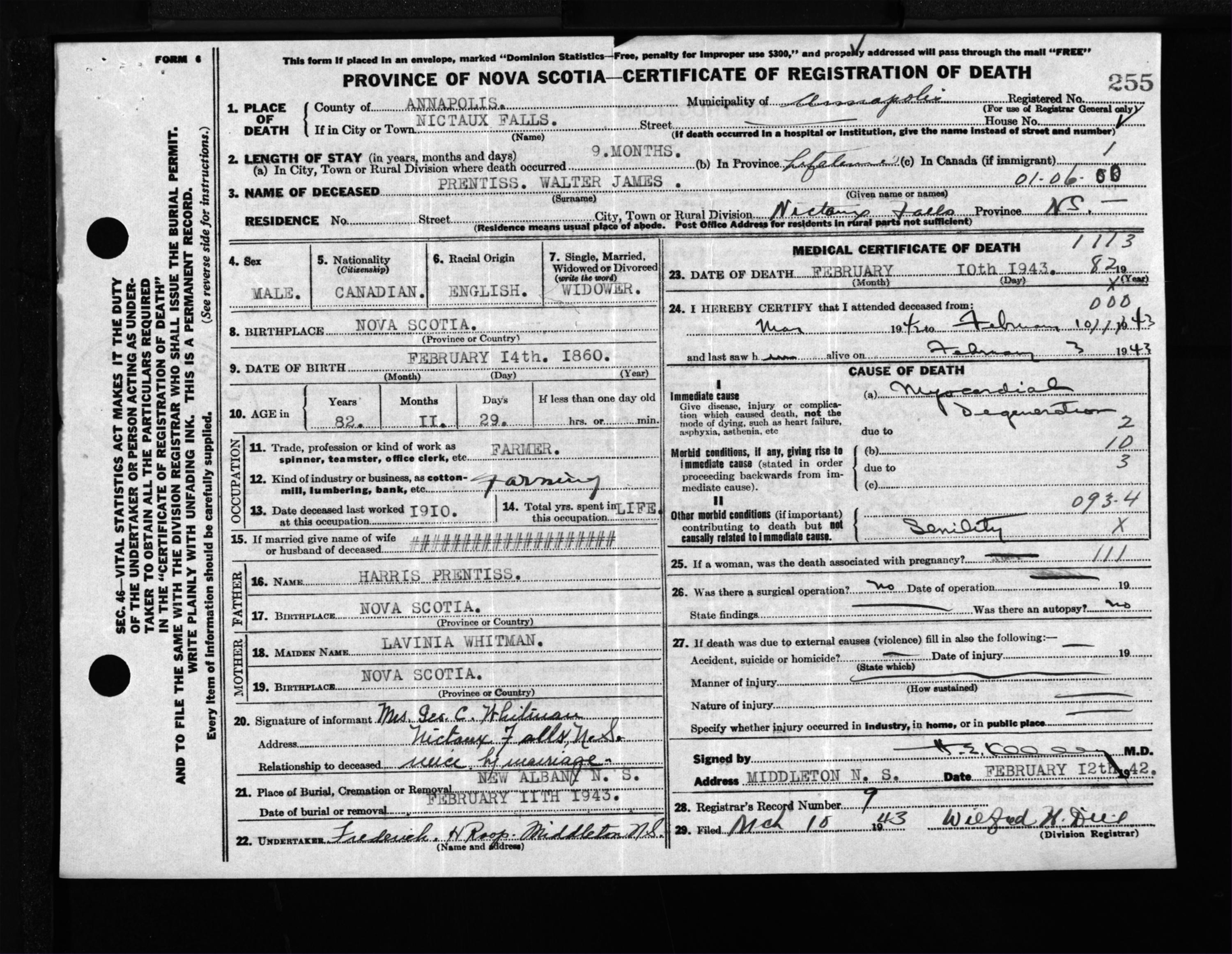 Male Death Registration: Year: 1943 file: 202 number: 255