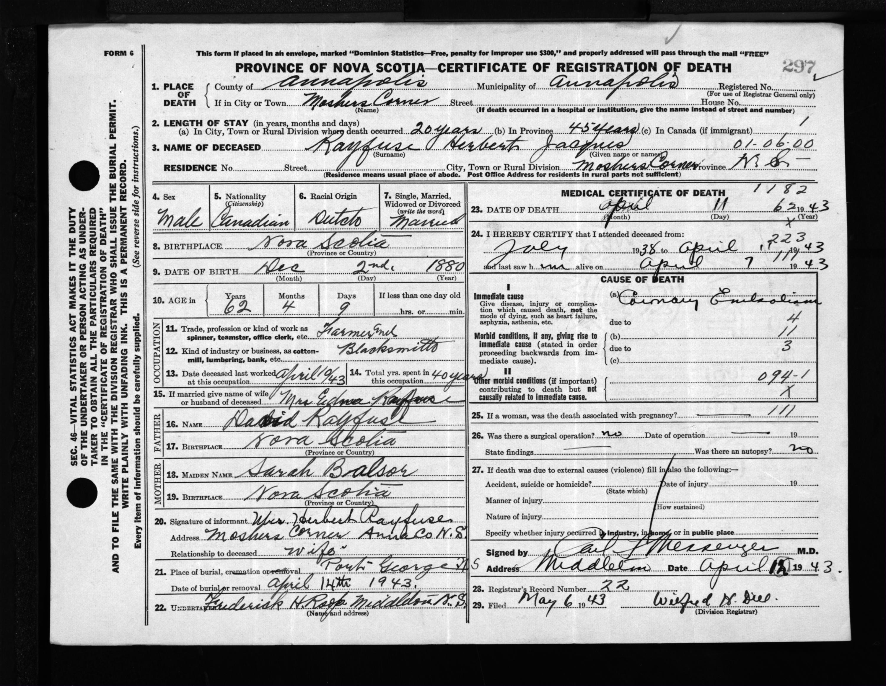 Male Death Registration: Year: 1943 file: 202 number: 297