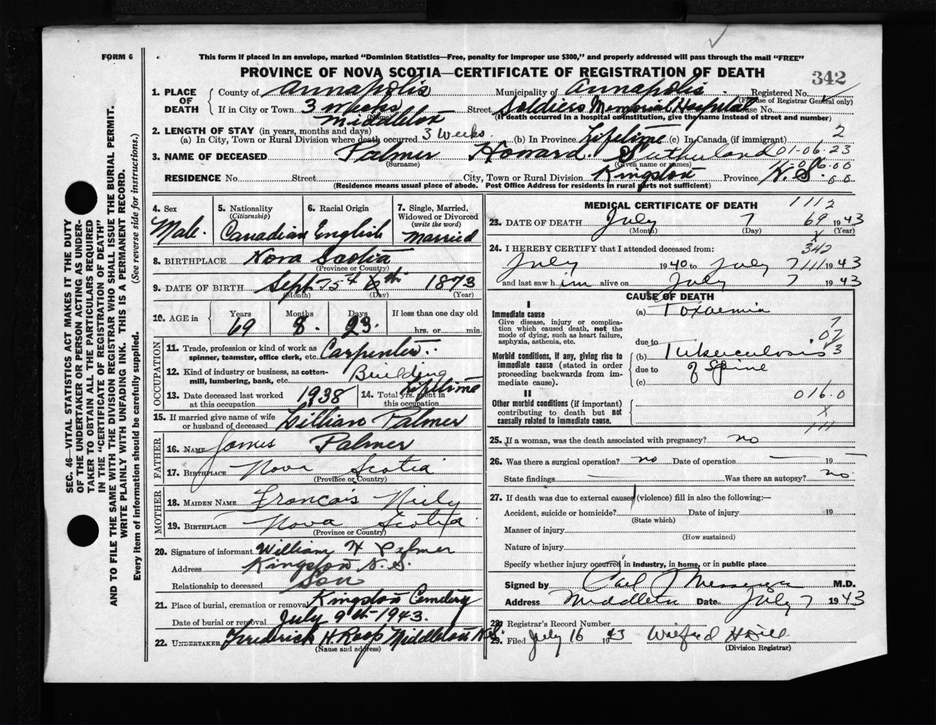 Male Death Registration: Year: 1943 file: 202 number: 342