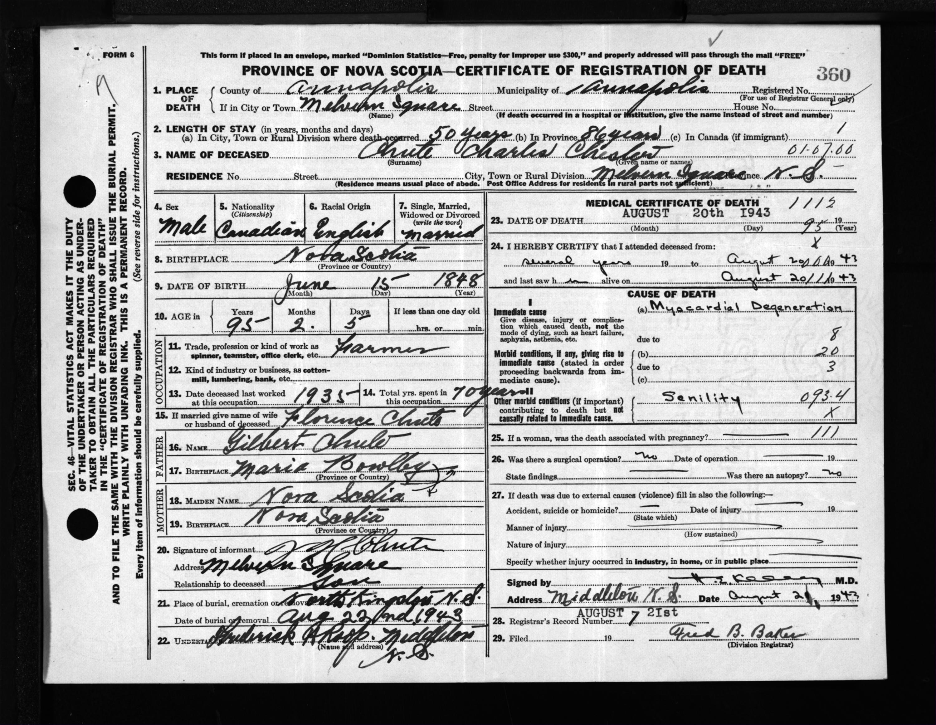 Male Death Registration: Year: 1943 file: 202 number: 360