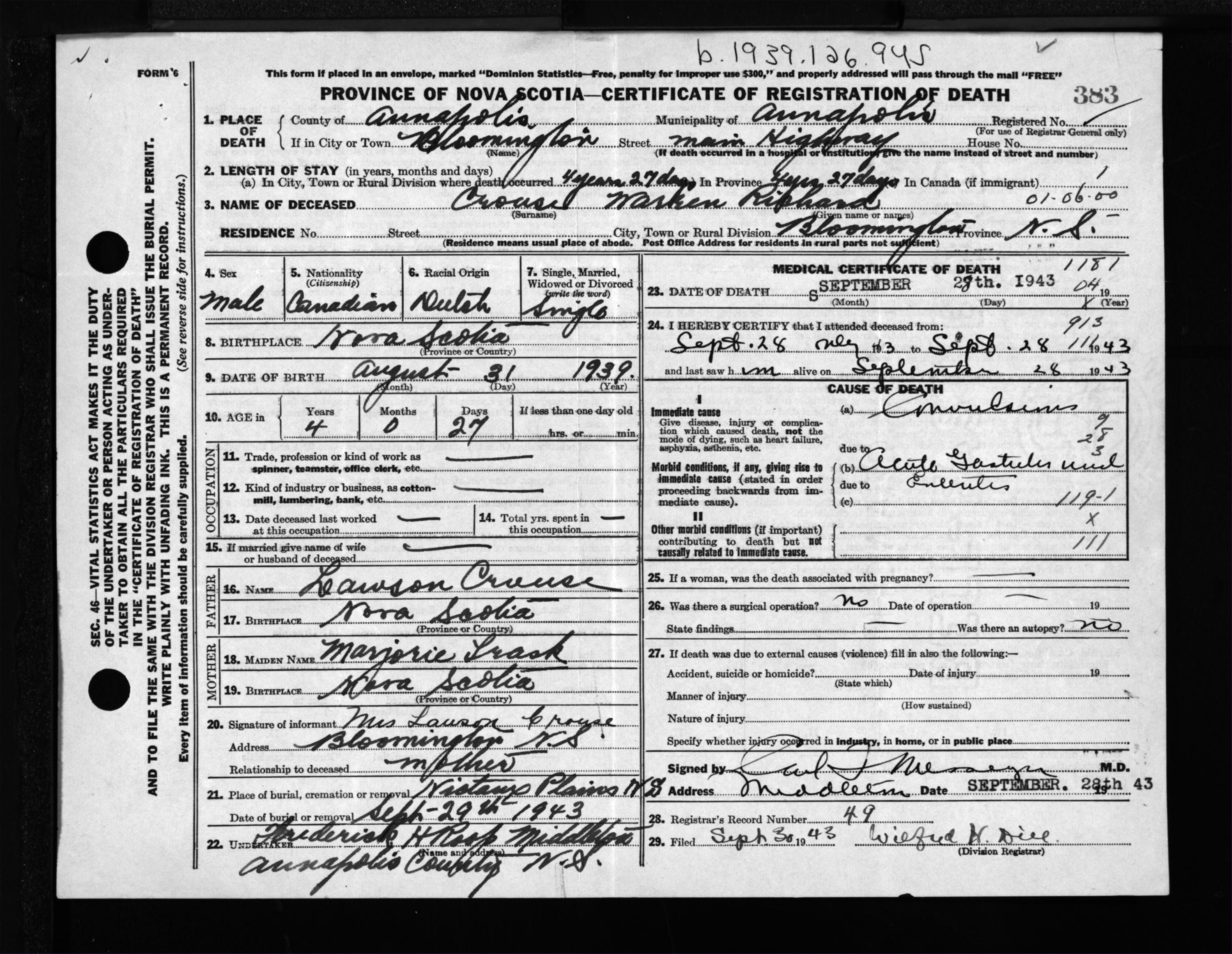 Male Death Registration: Year: 1943 file: 202 number: 383