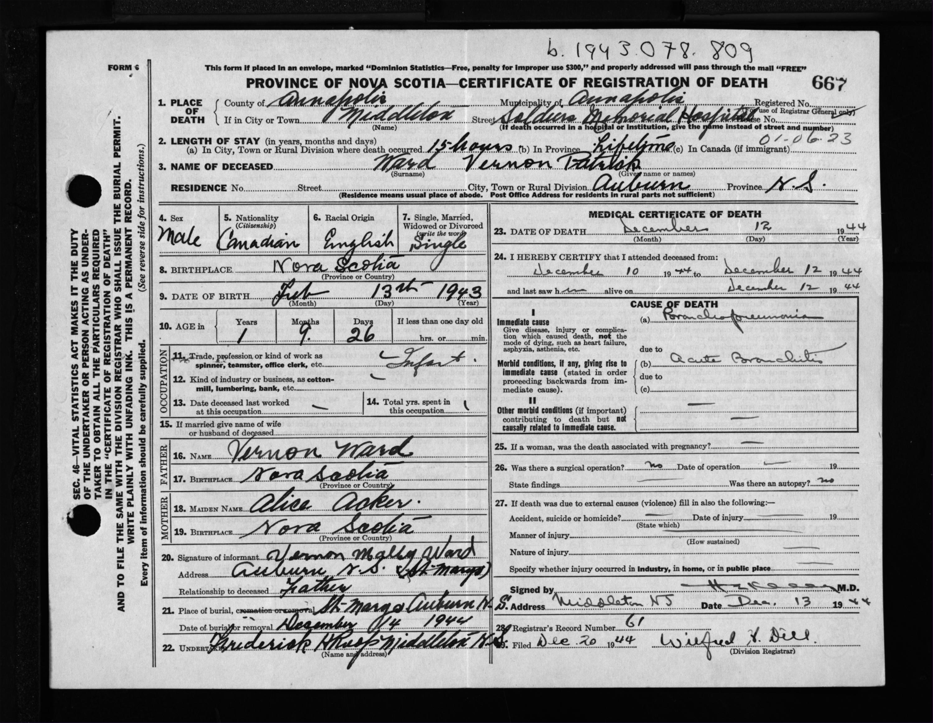 Male Death Registration: Year: 1944 file: 202 number: 667