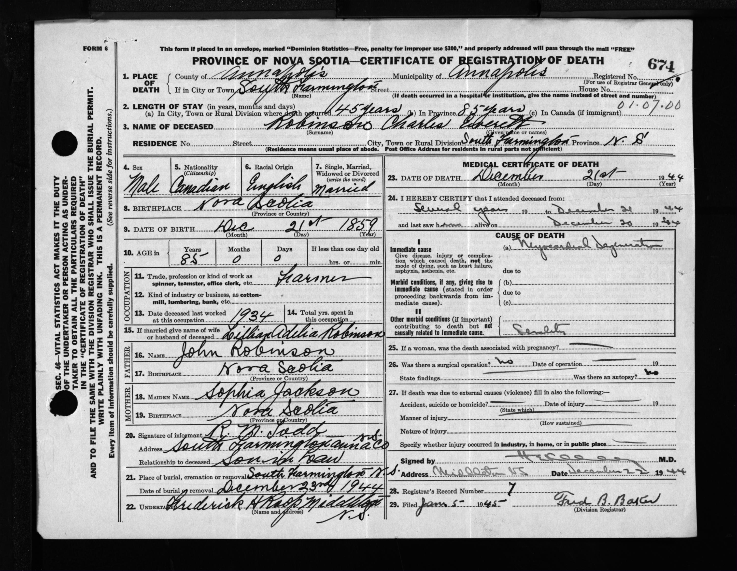 Male Death Registration: Year: 1944 file: 202 number: 674