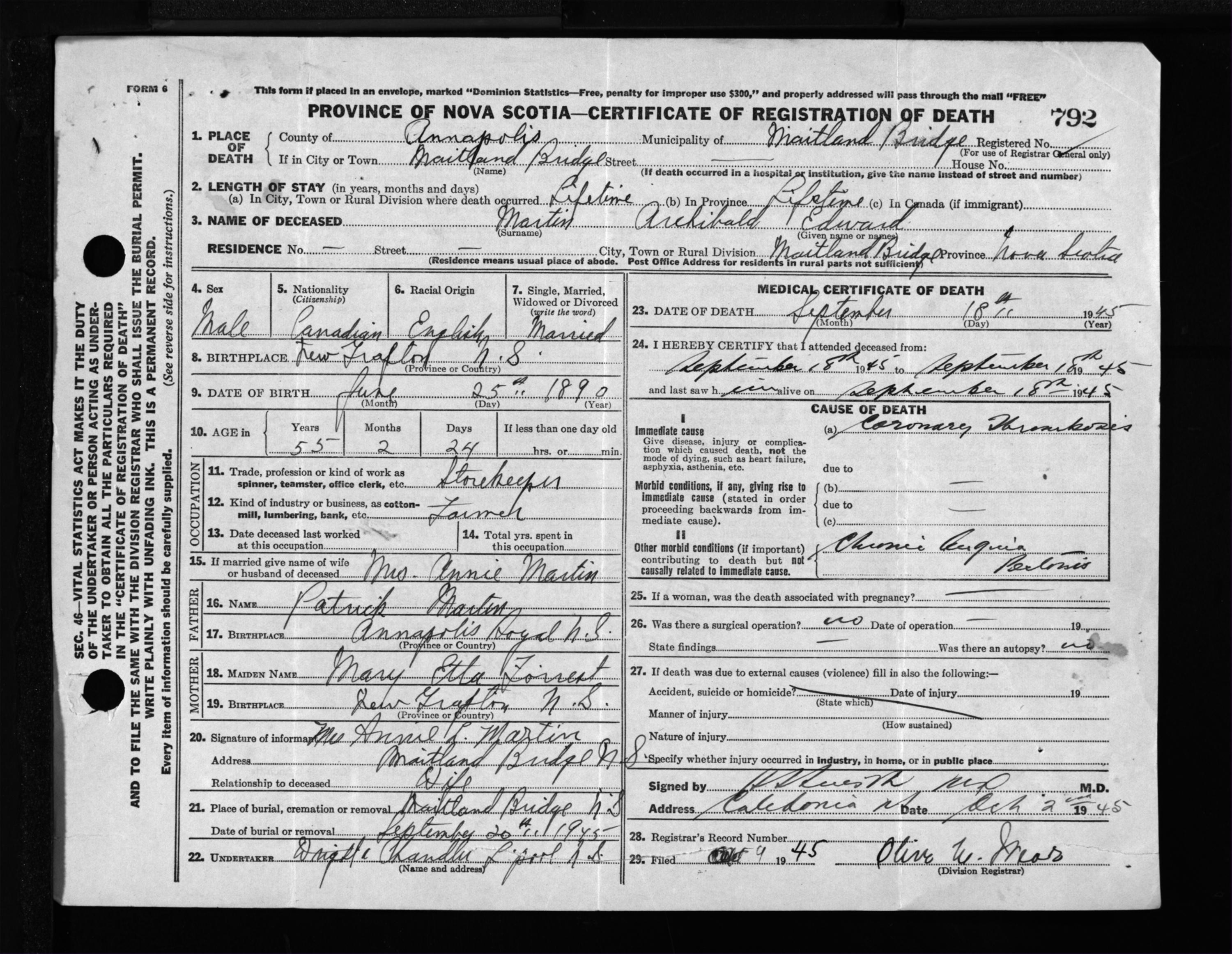 Male Death Registration: Year: 1945 file: 202 number: 792