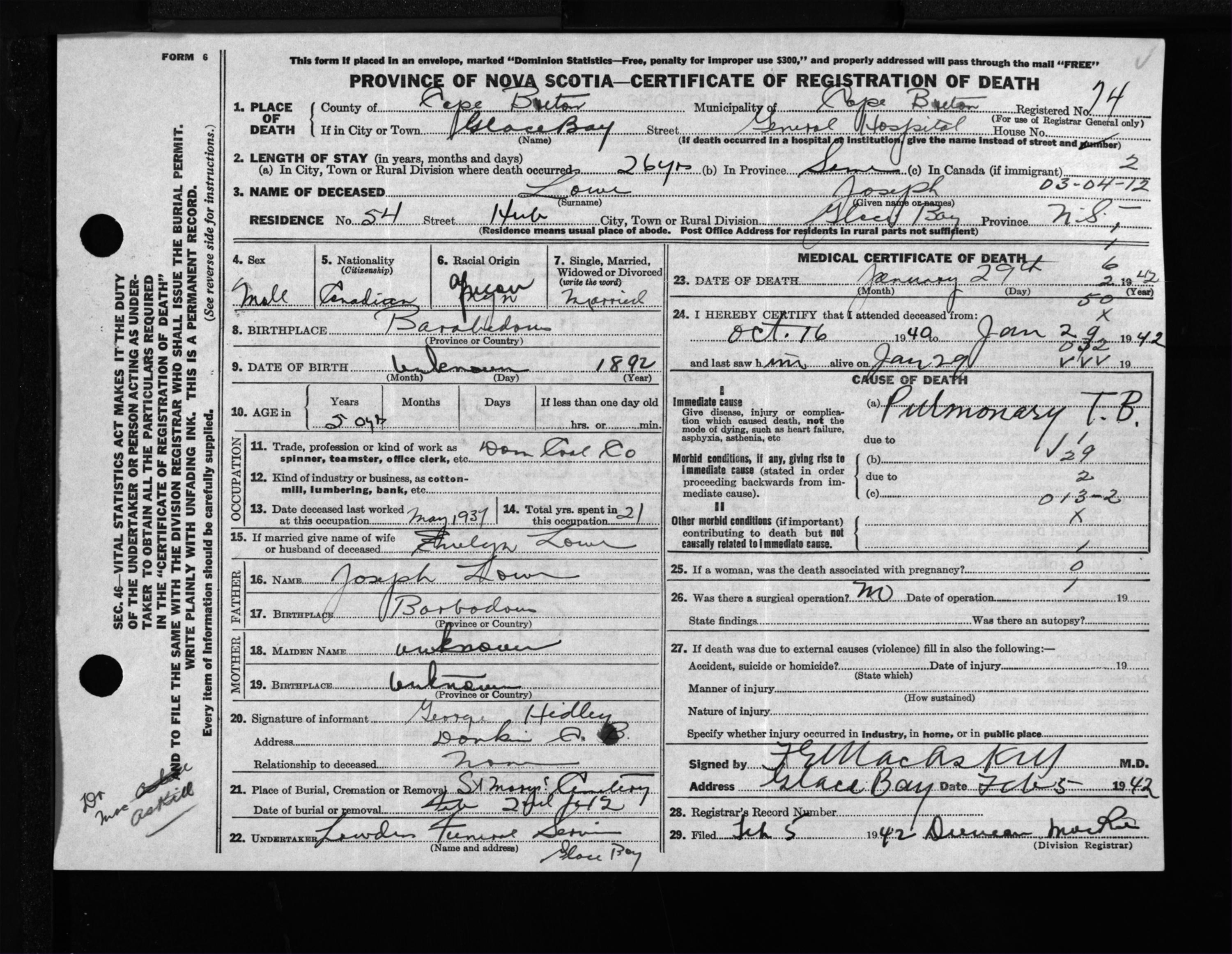 Male Death Registration: Year: 1942 file: 203 number: 74