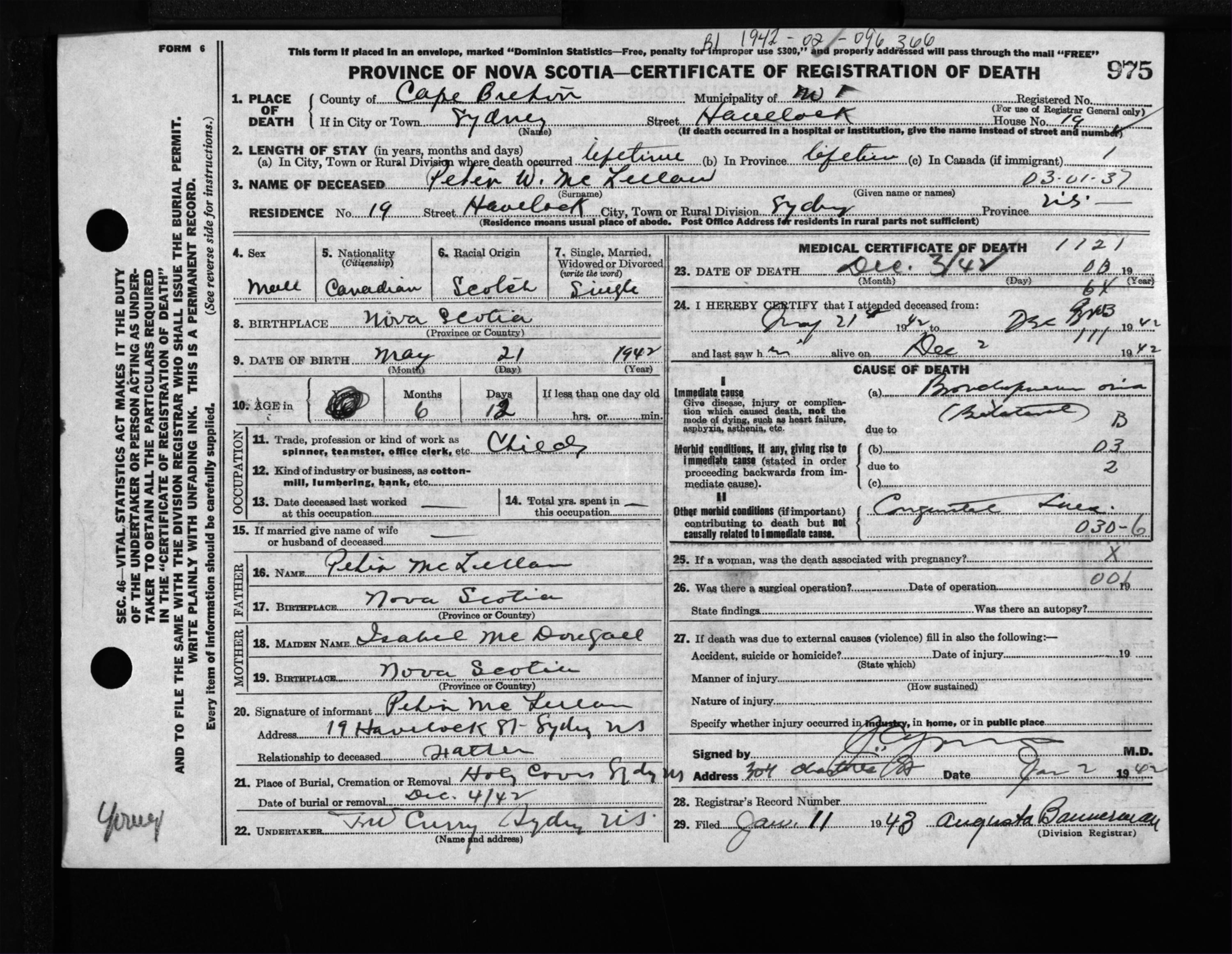 Male Death Registration: Year: 1942 file: 203 number: 975