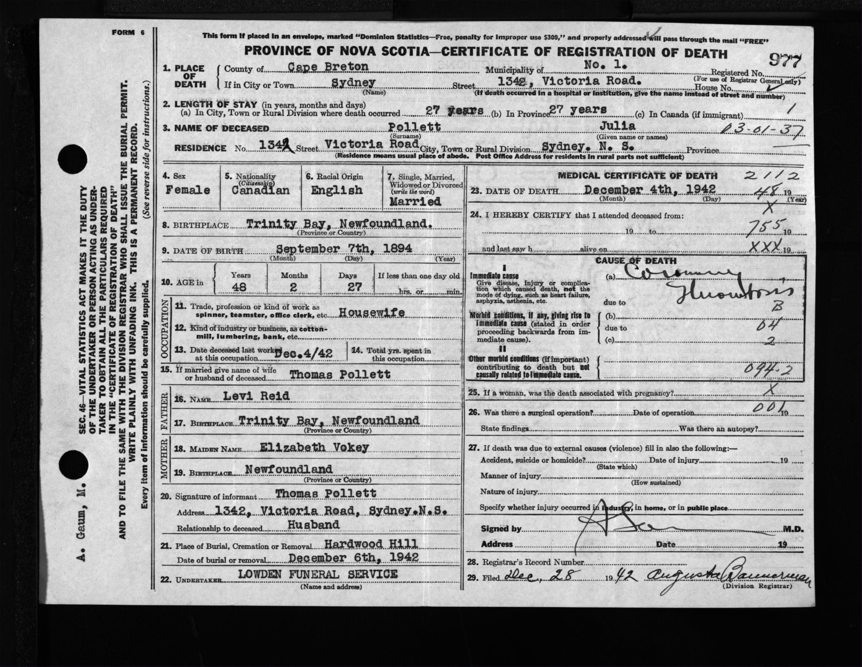 Female Death Registration: Year: 1942 file: 203 number: 977