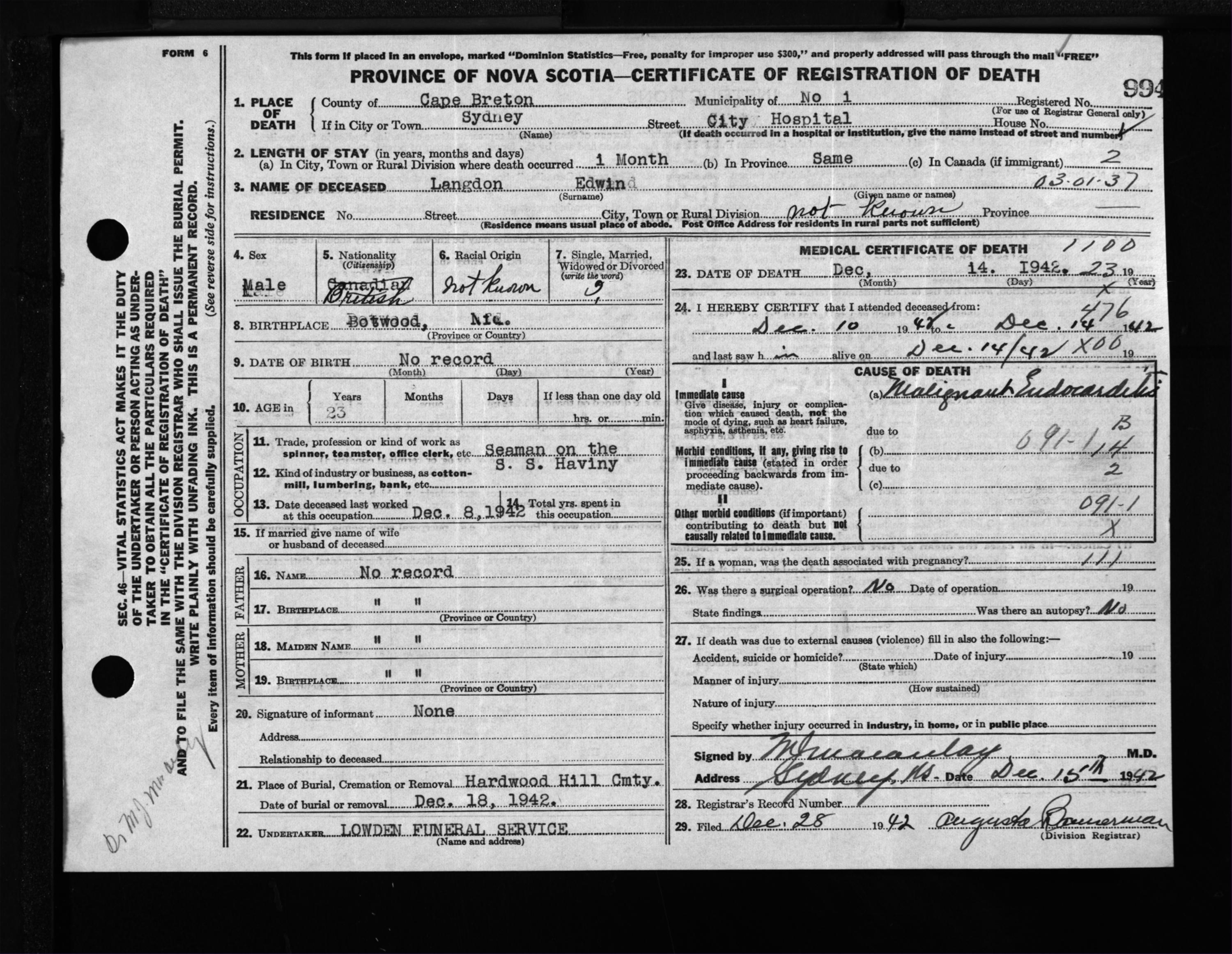 Male Death Registration: Year: 1942 file: 203 number: 994