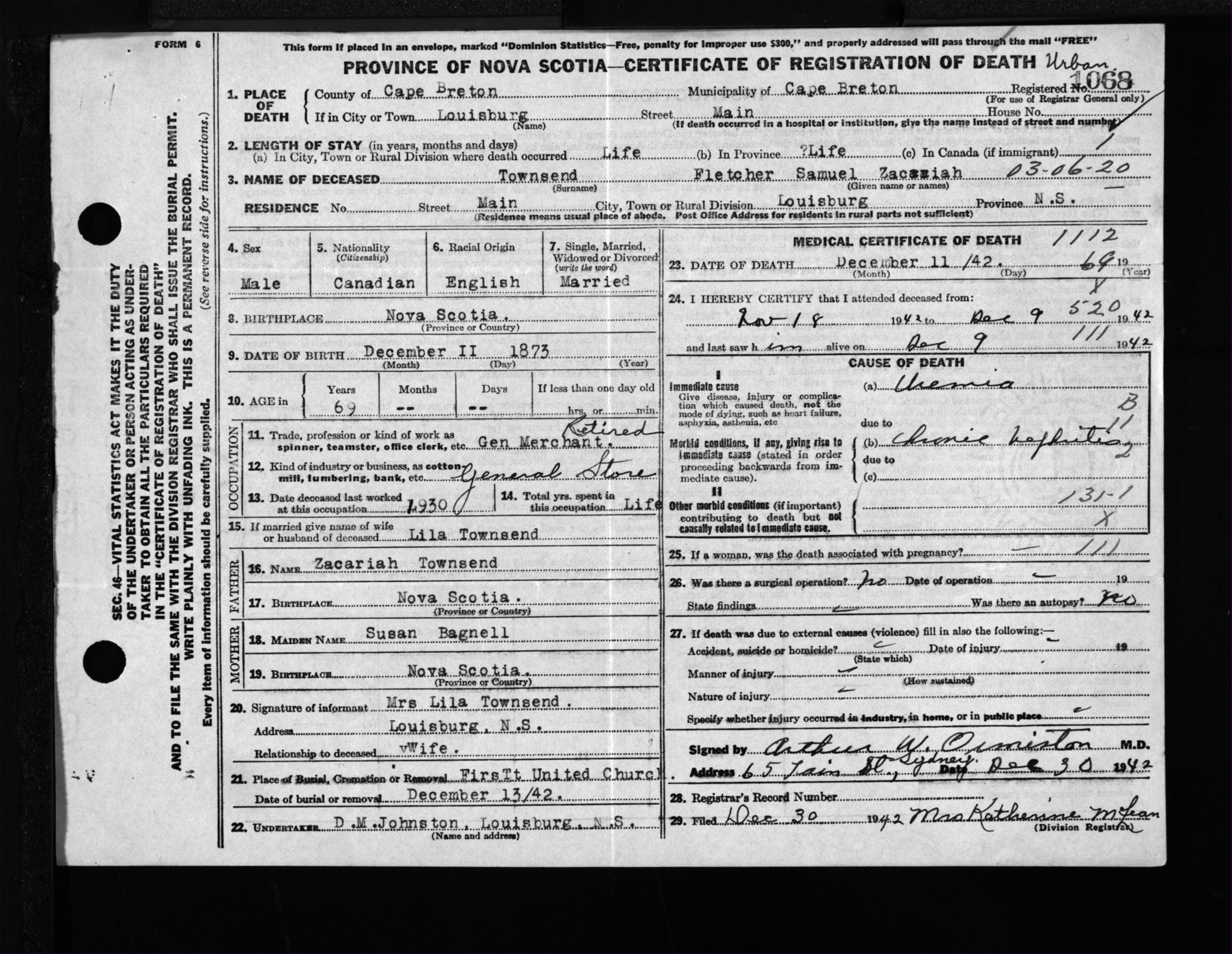 Male Death Registration: Year: 1942 file: 203 number: 1068