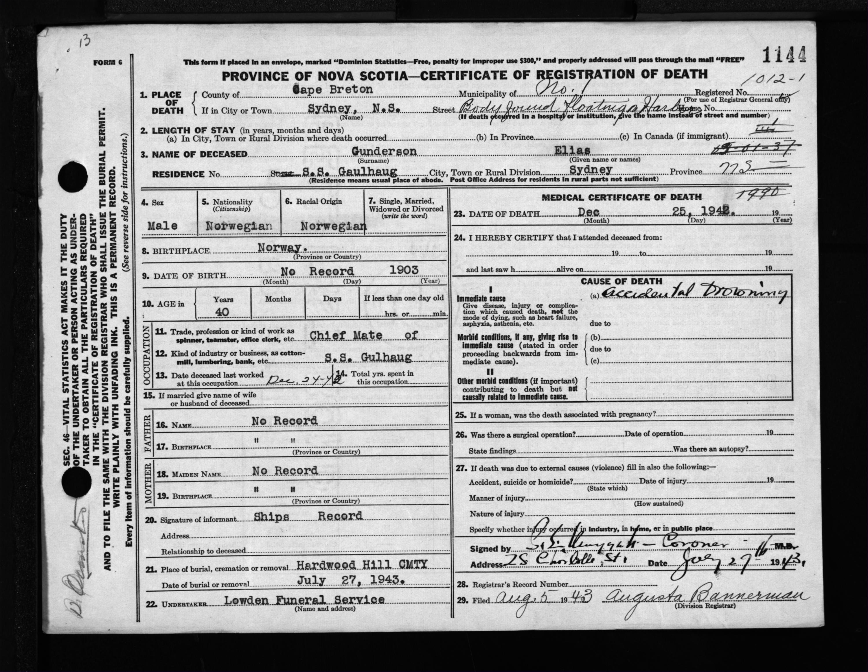 Male Death Registration: Year: 1942 file: 203 number: 1144