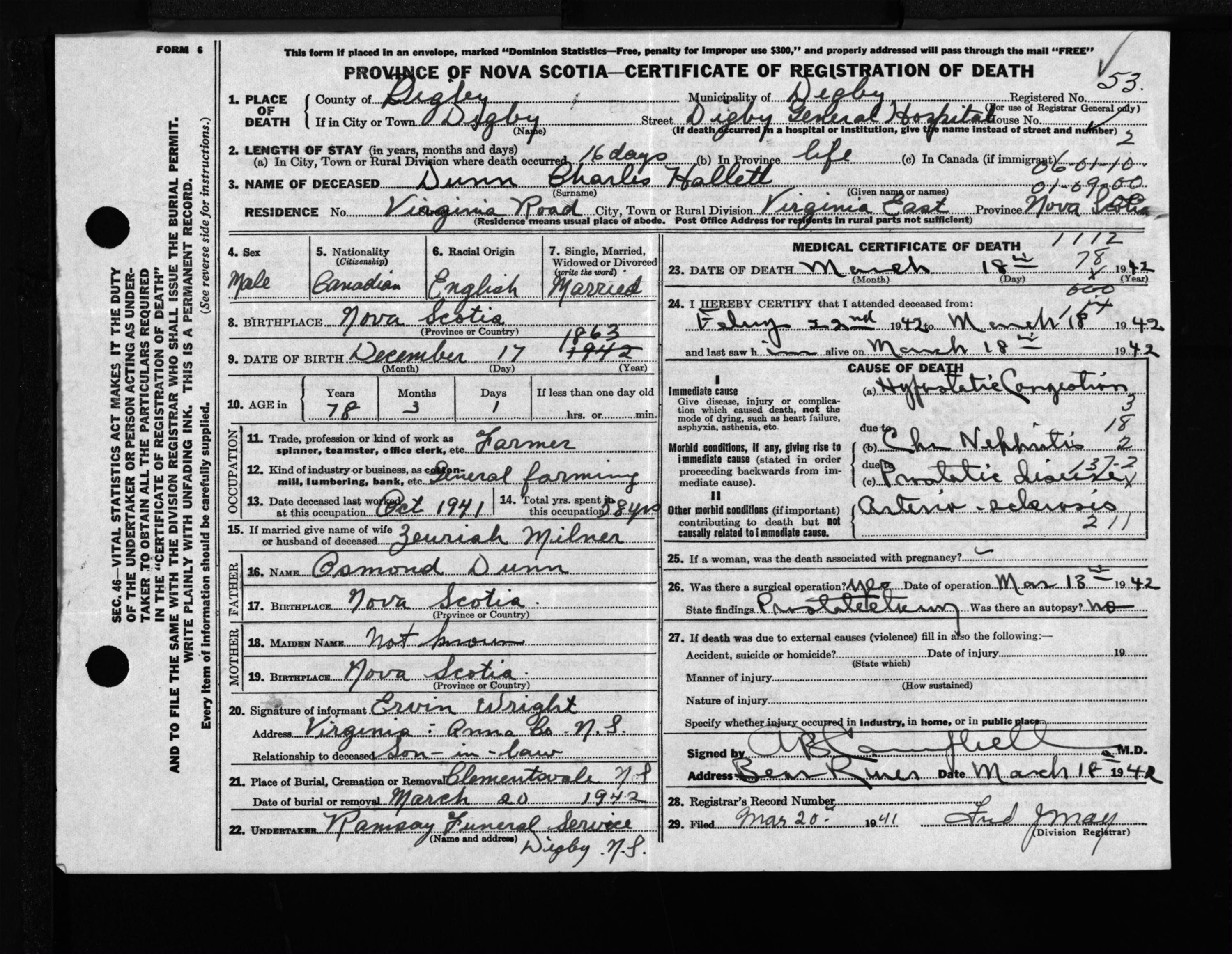 Male Death Registration: Year: 1942 file: 204 number: 53