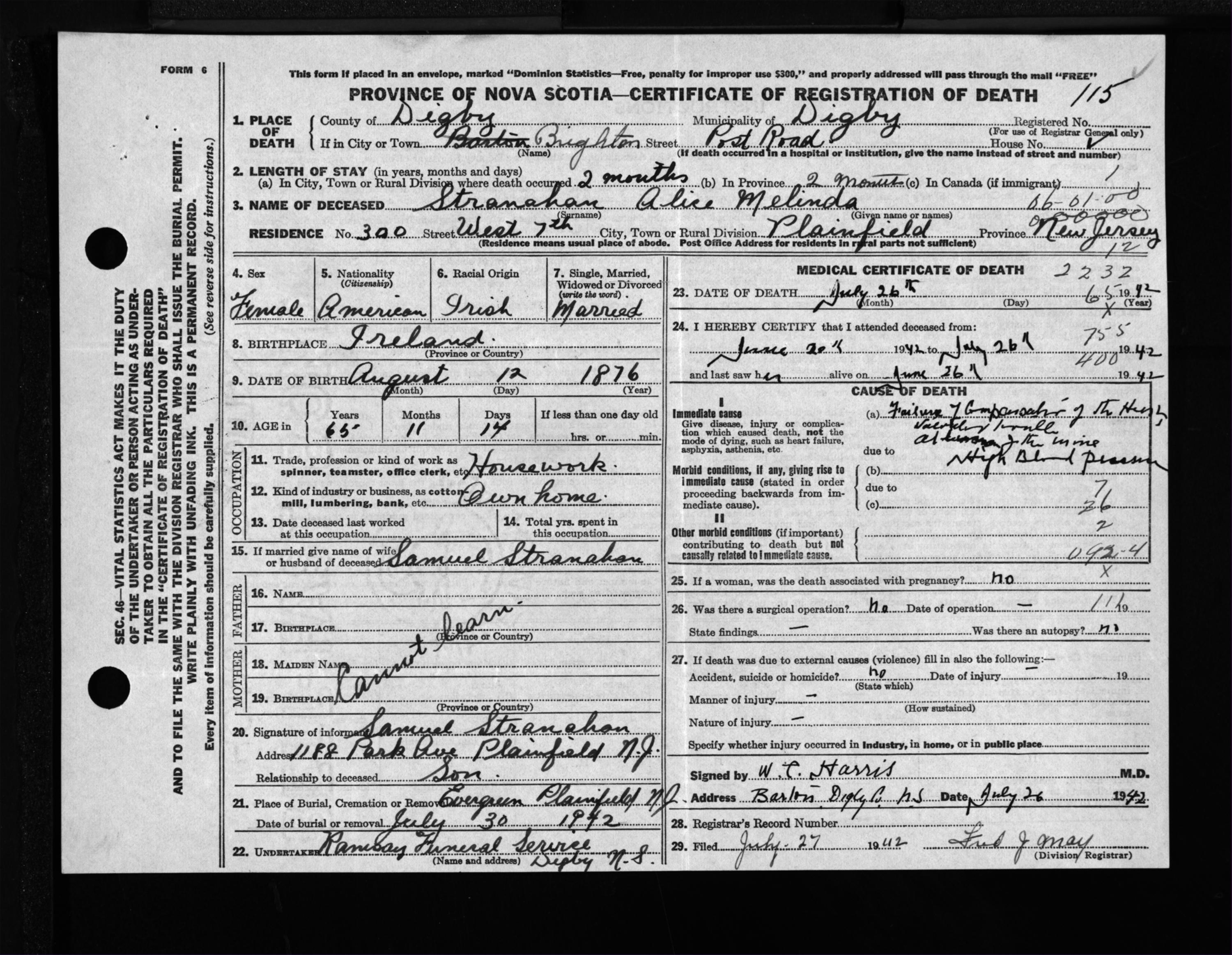 Female Death Registration: Year: 1942 file: 204 number: 115