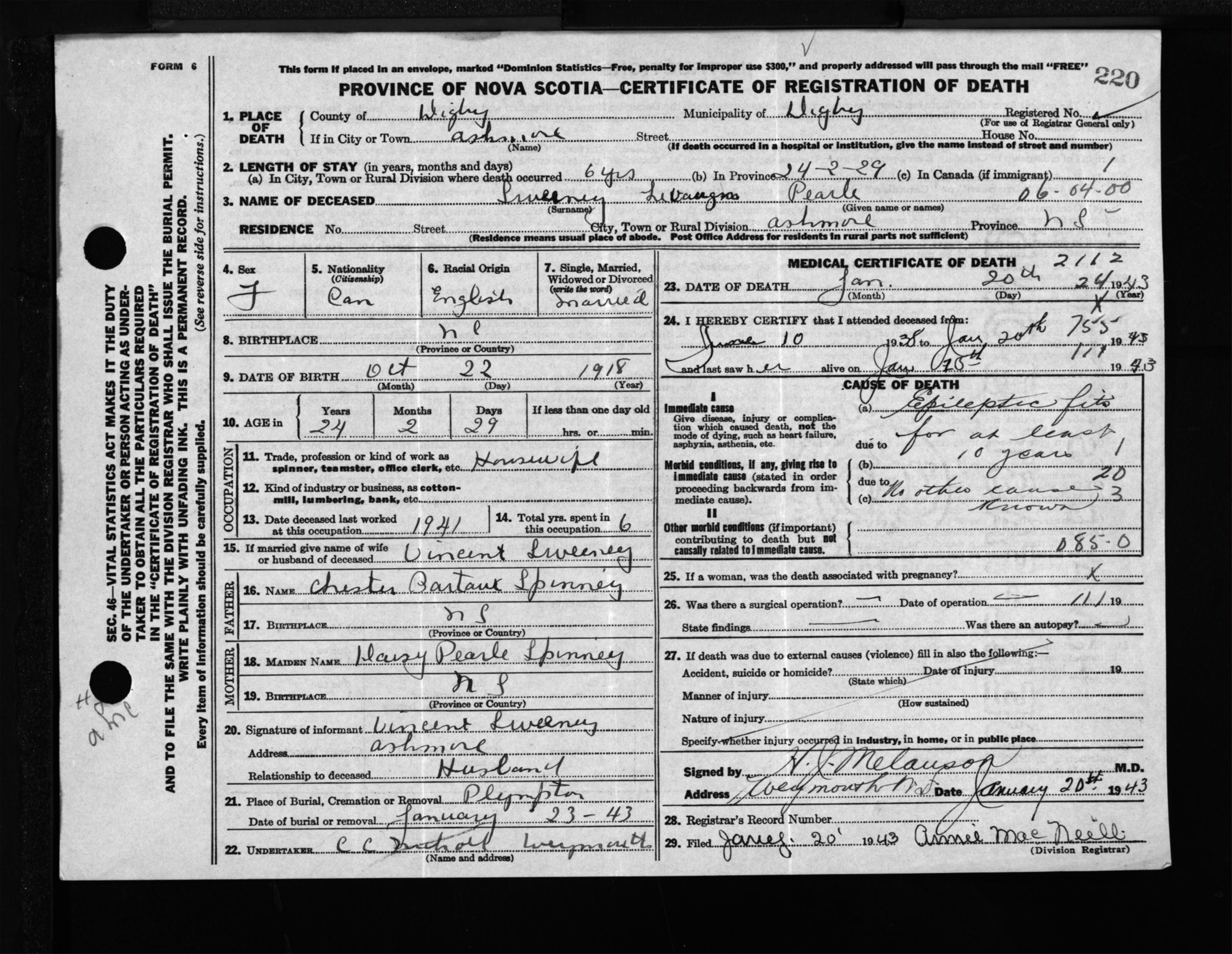 Female Death Registration: Year: 1943 file: 204 number: 220