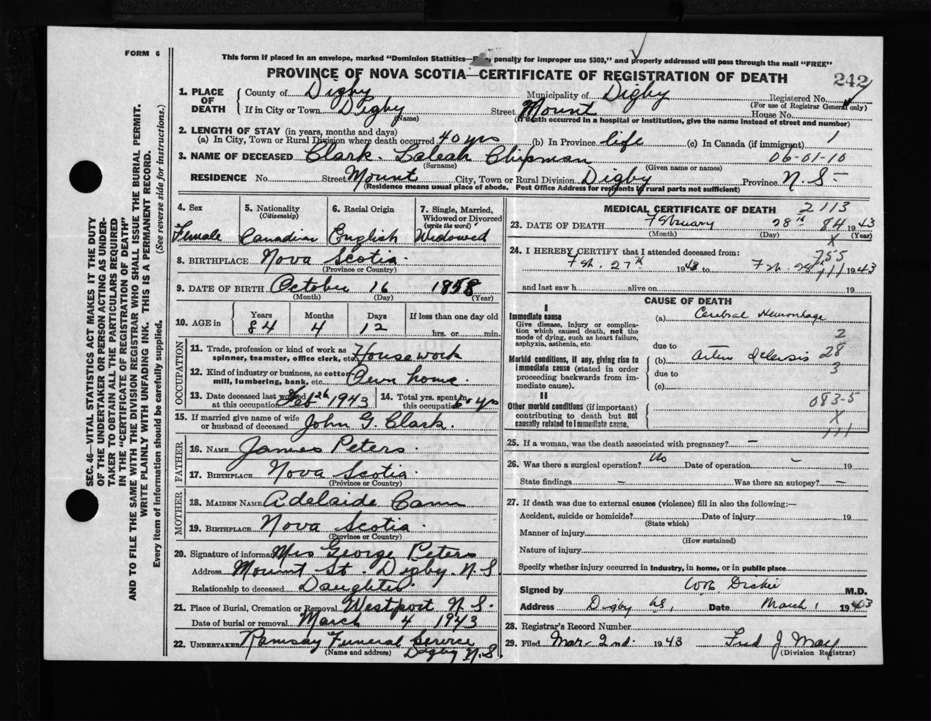 Female Death Registration: Year: 1943 file: 204 number: 242