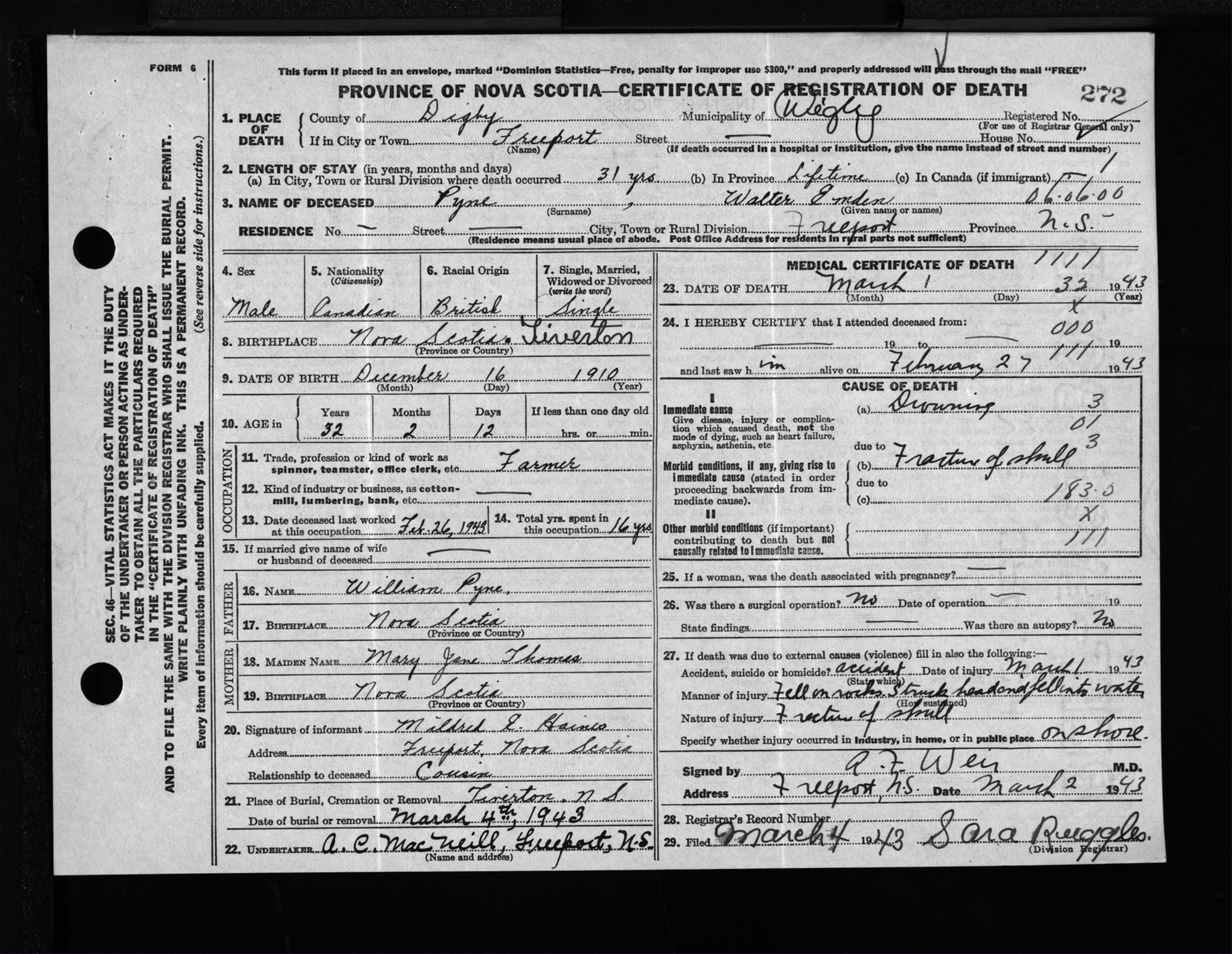 Male Death Registration: Year: 1943 file: 204 number: 272