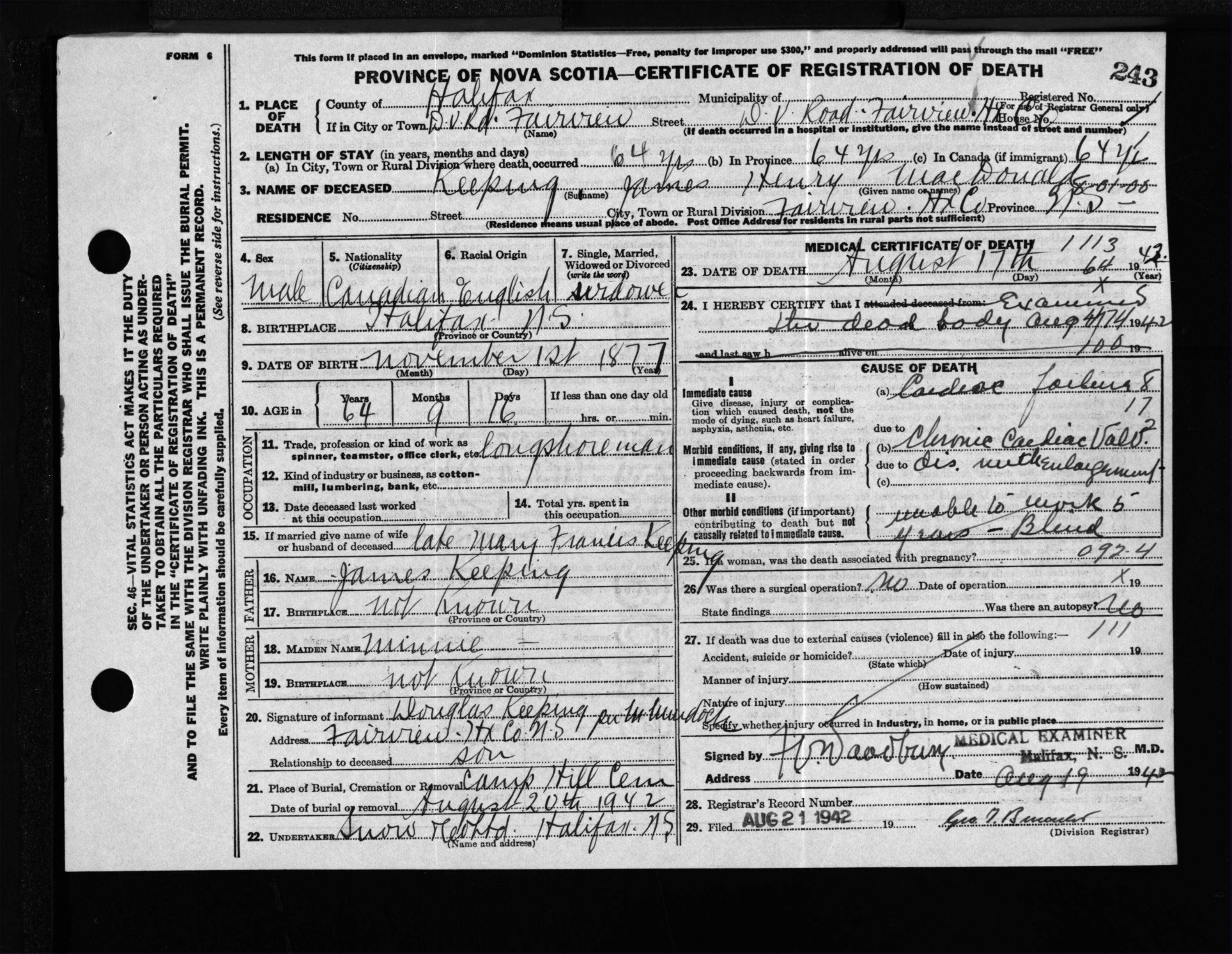 Male Death Registration: Year: 1942 file: 205 number: 243