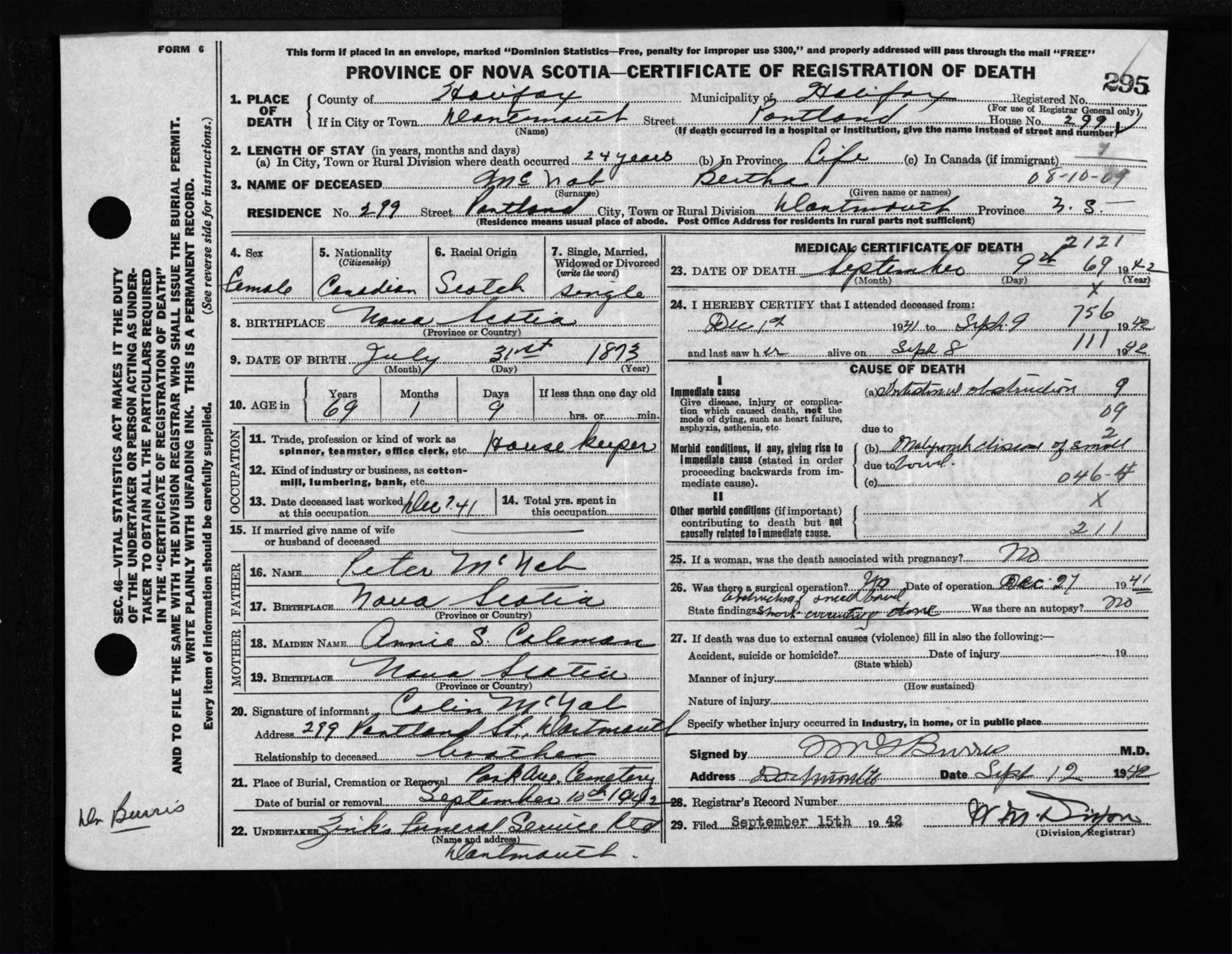 Female Death Registration: Year: 1942 file: 205 number: 295
