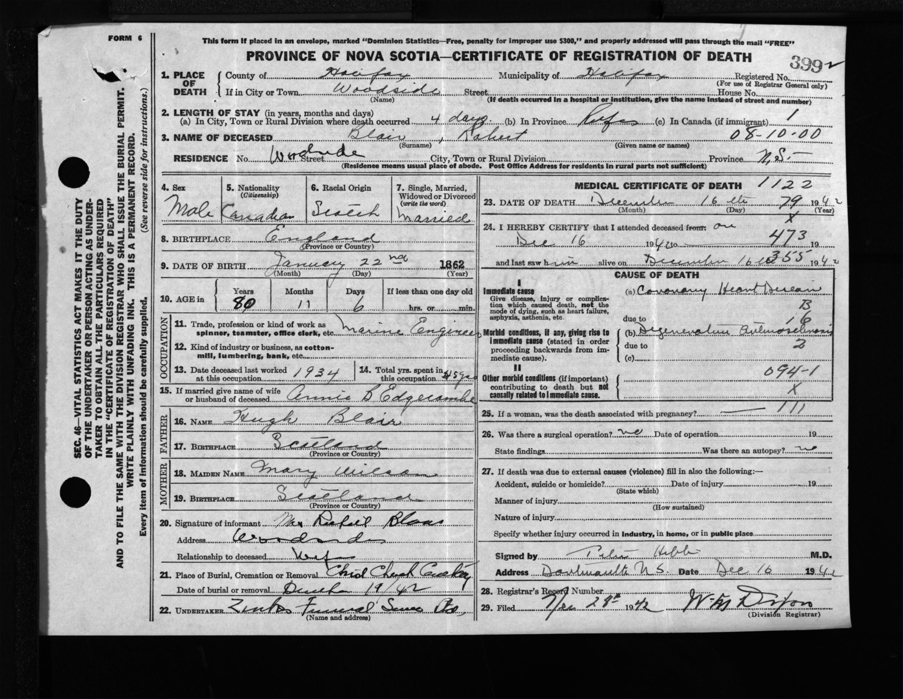 Male Death Registration: Year: 1942 file: 205 number: 399