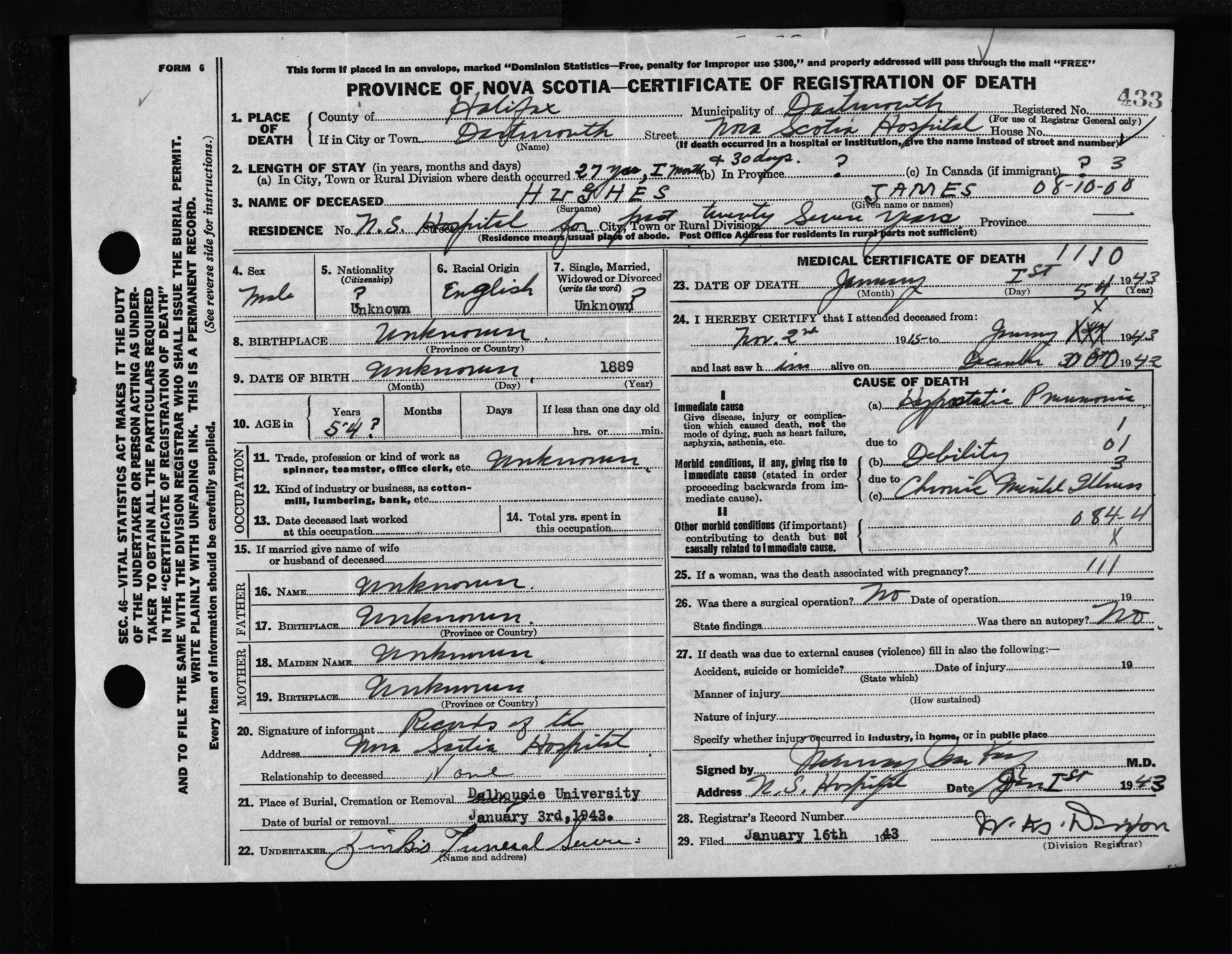 Male Death Registration: Year: 1943 file: 205 number: 433