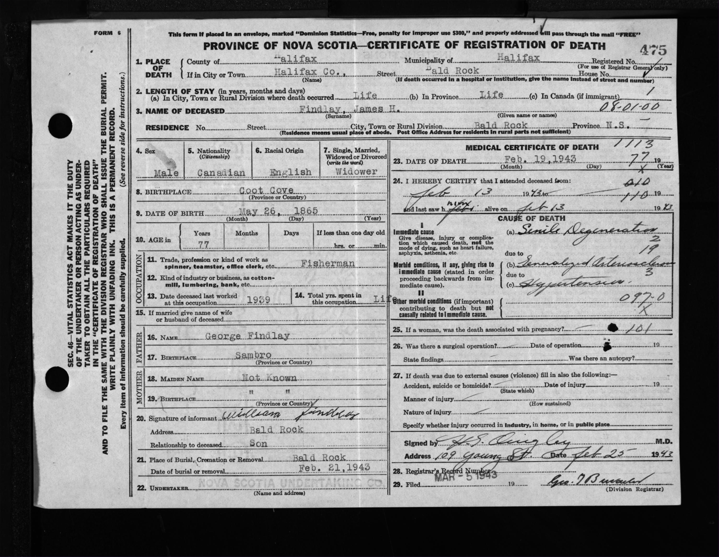 Male Death Registration: Year: 1943 file: 205 number: 475