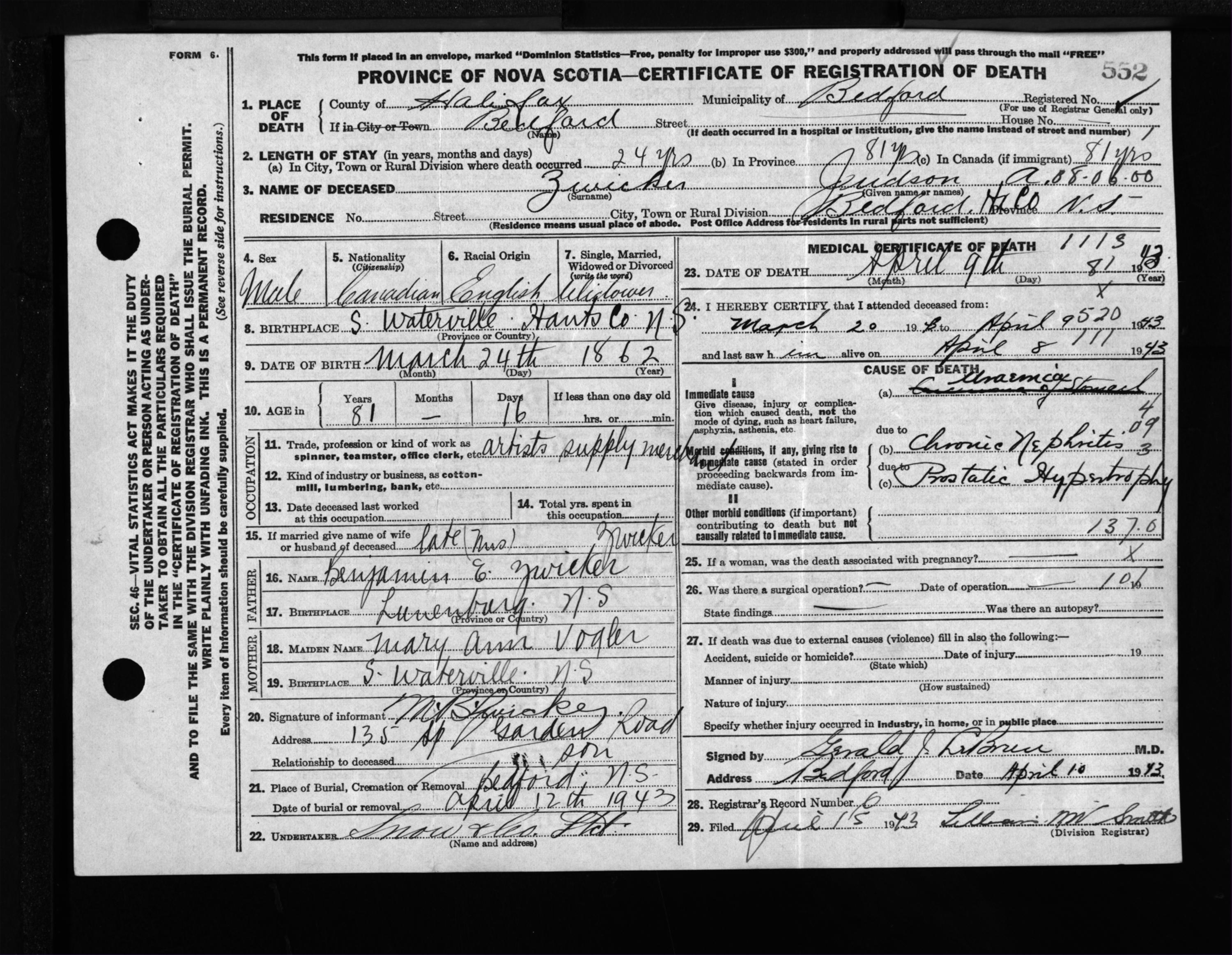 Male Death Registration: Year: 1943 file: 205 number: 552