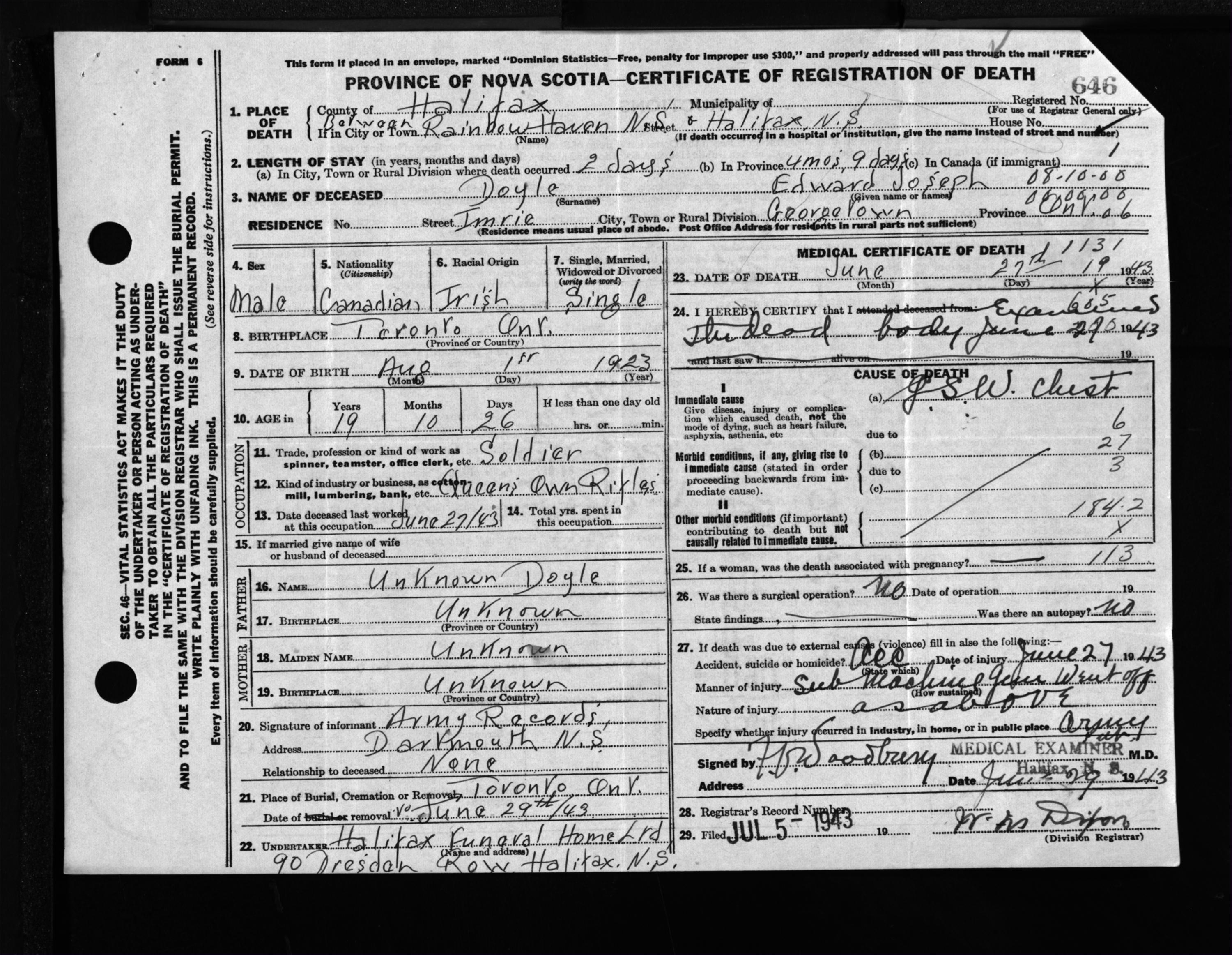 Male Death Registration: Year: 1943 file: 205 number: 646