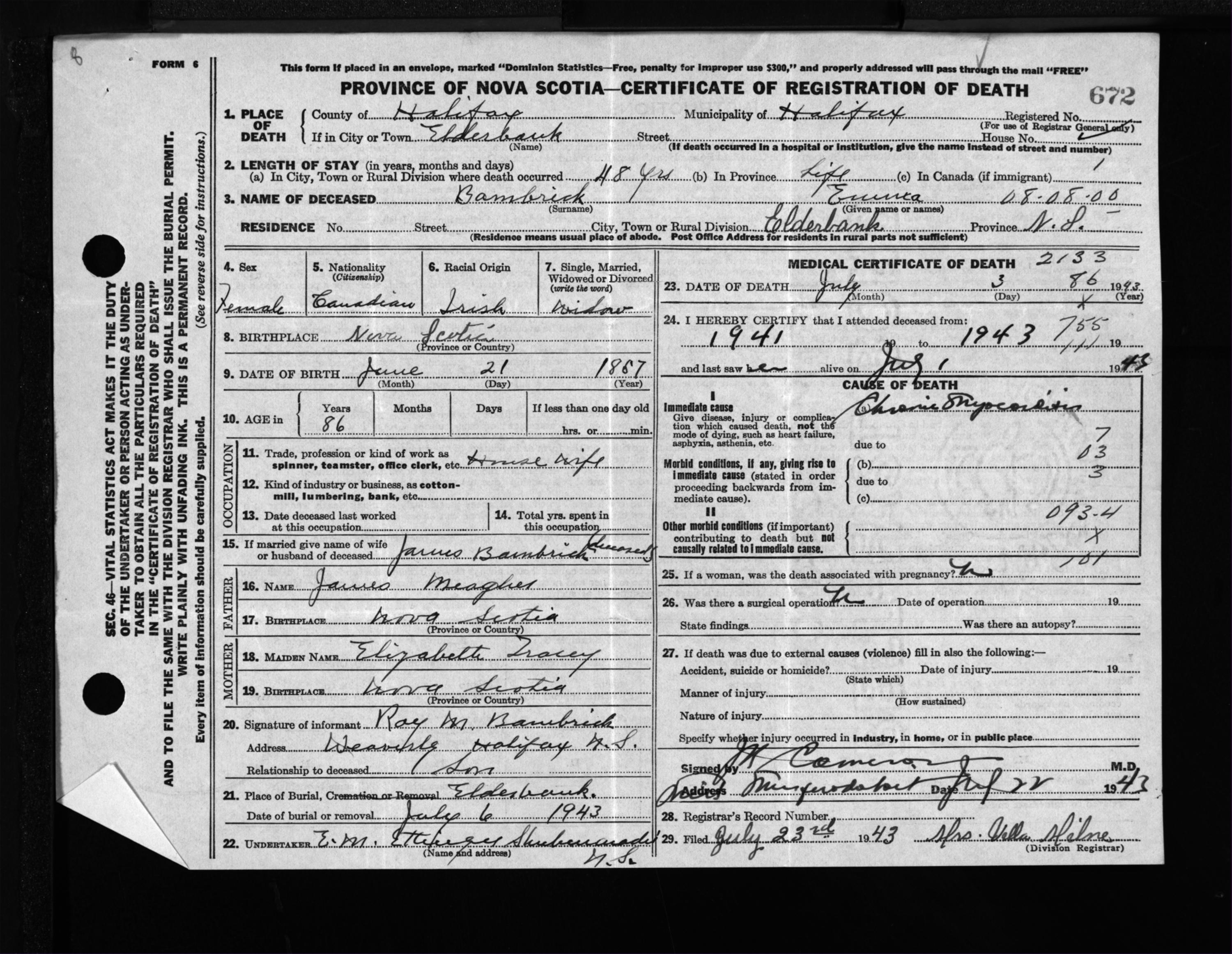 Female Death Registration: Year: 1943 file: 205 number: 672