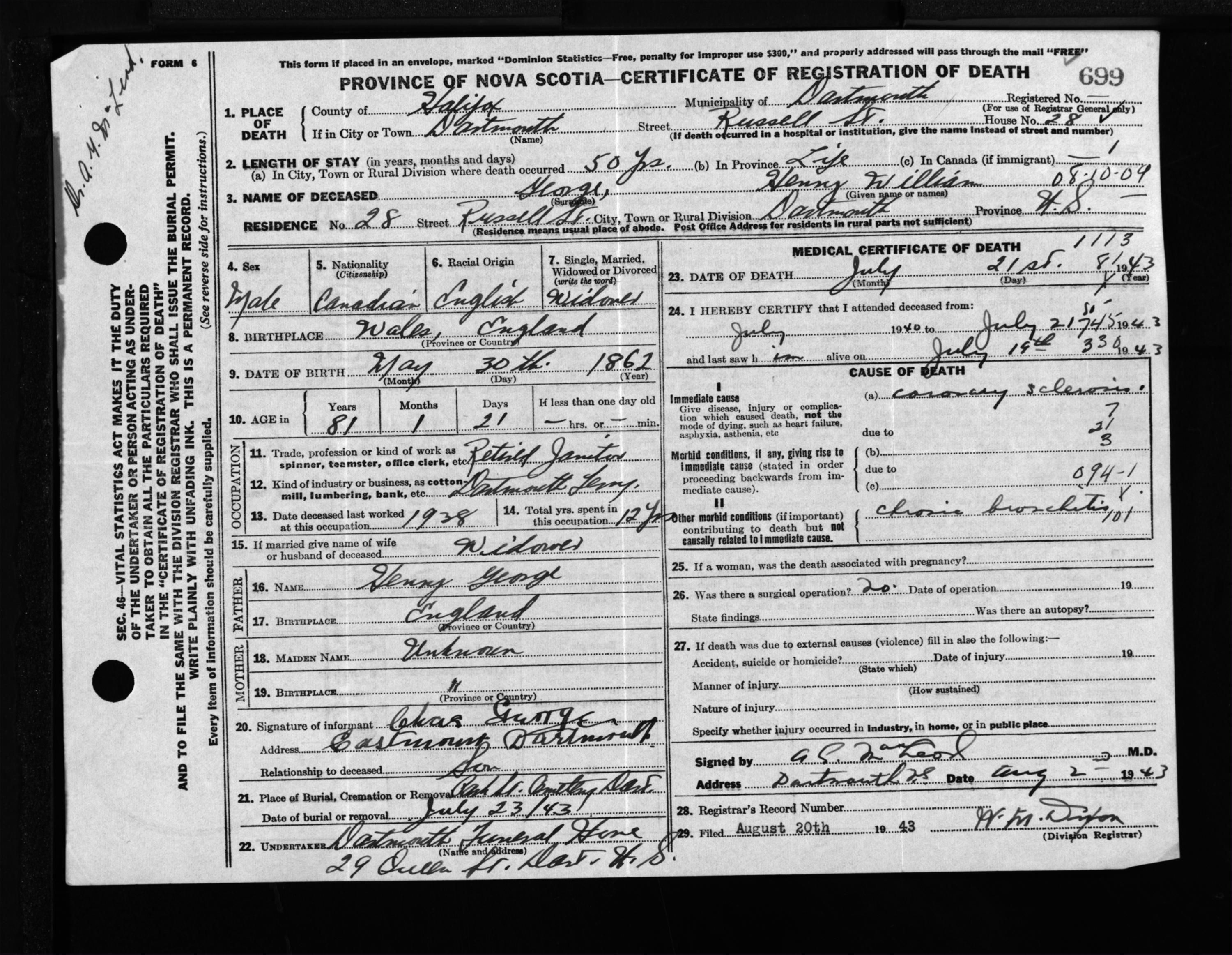 Male Death Registration: Year: 1943 file: 205 number: 699