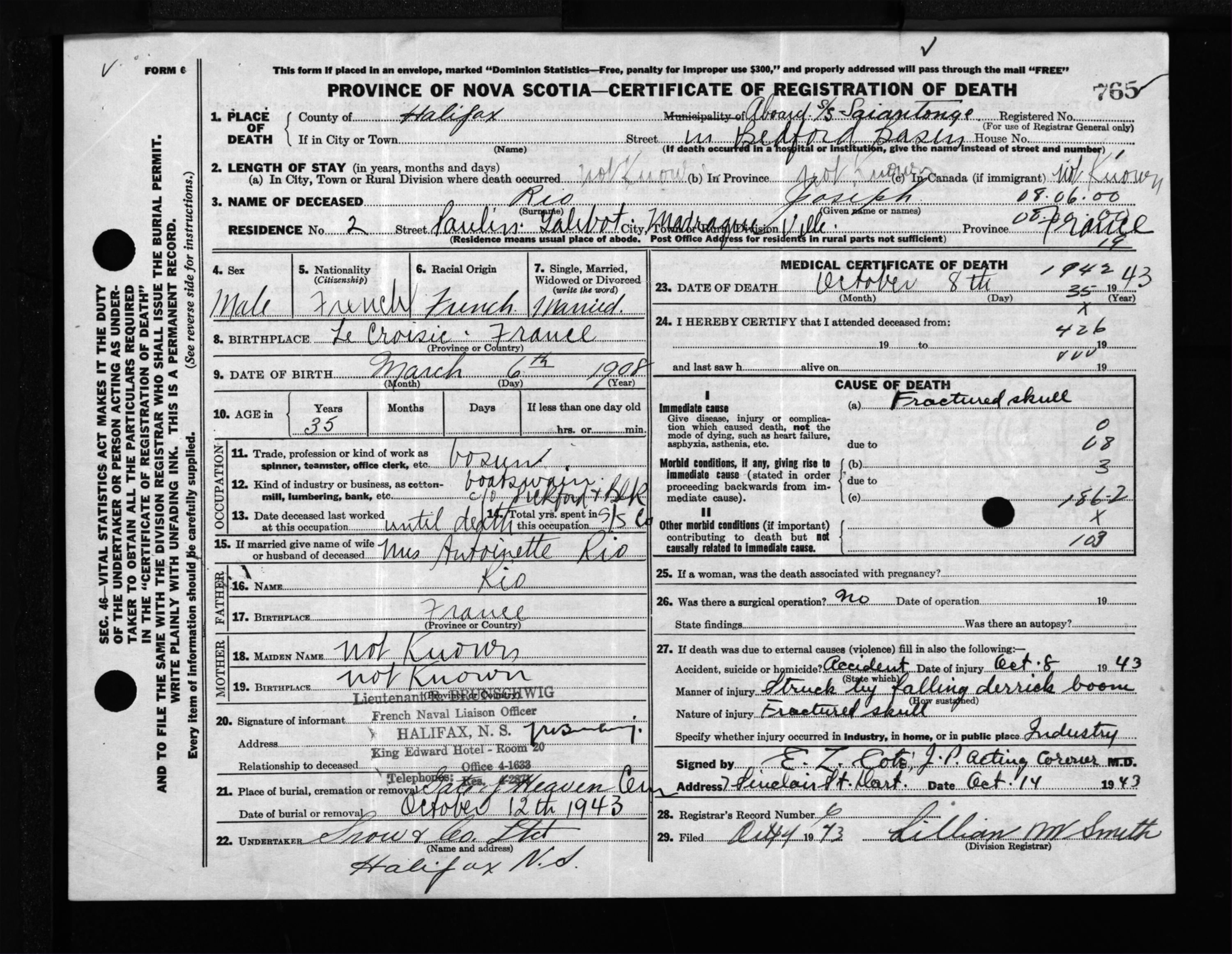 Male Death Registration: Year: 1943 file: 205 number: 765