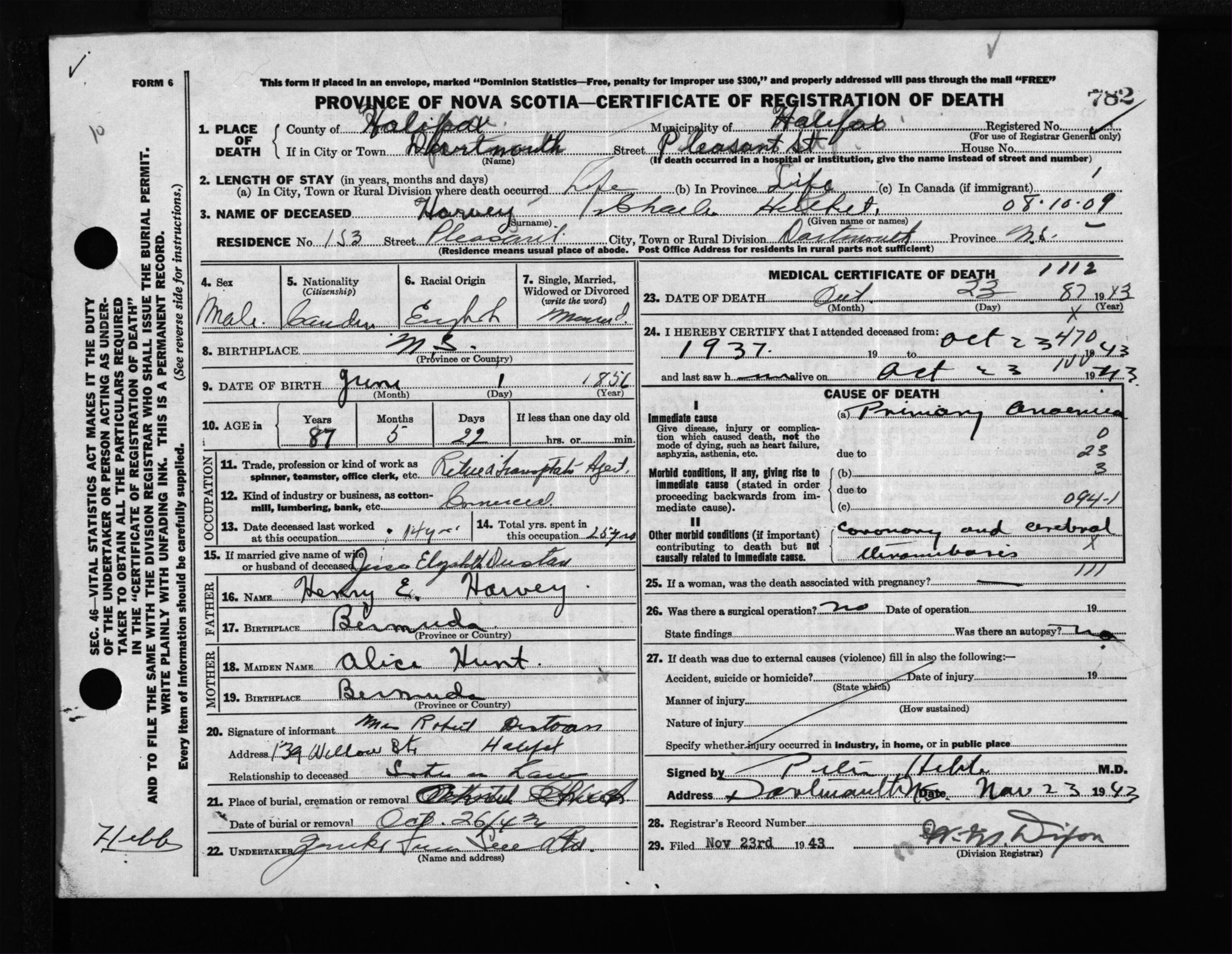 Male Death Registration: Year: 1943 file: 205 number: 782