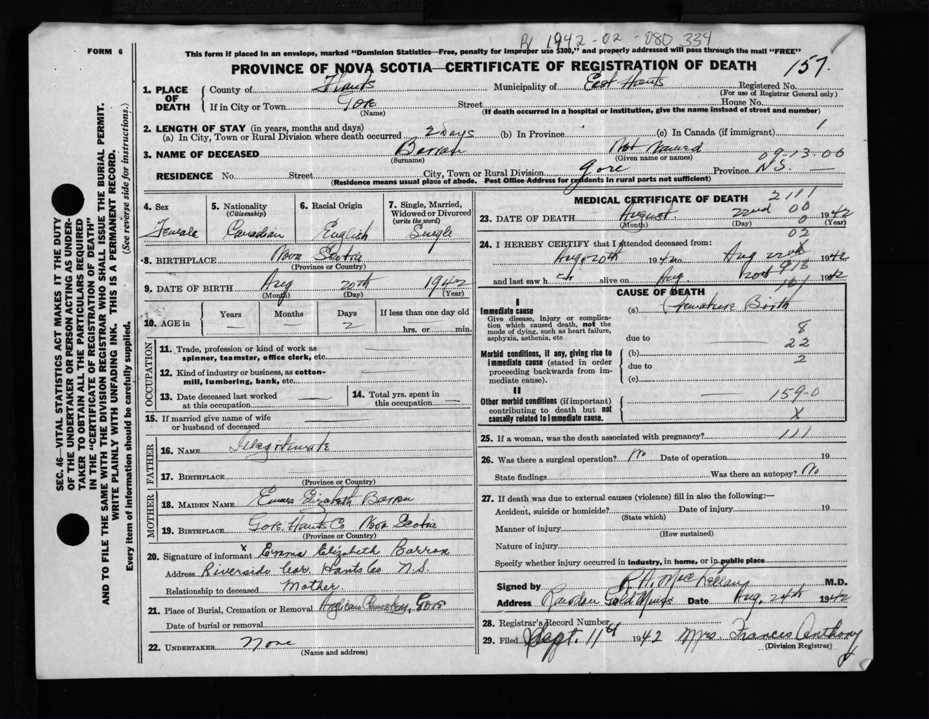 Female Death Registration: Year: 1942 file: 206 number: 157