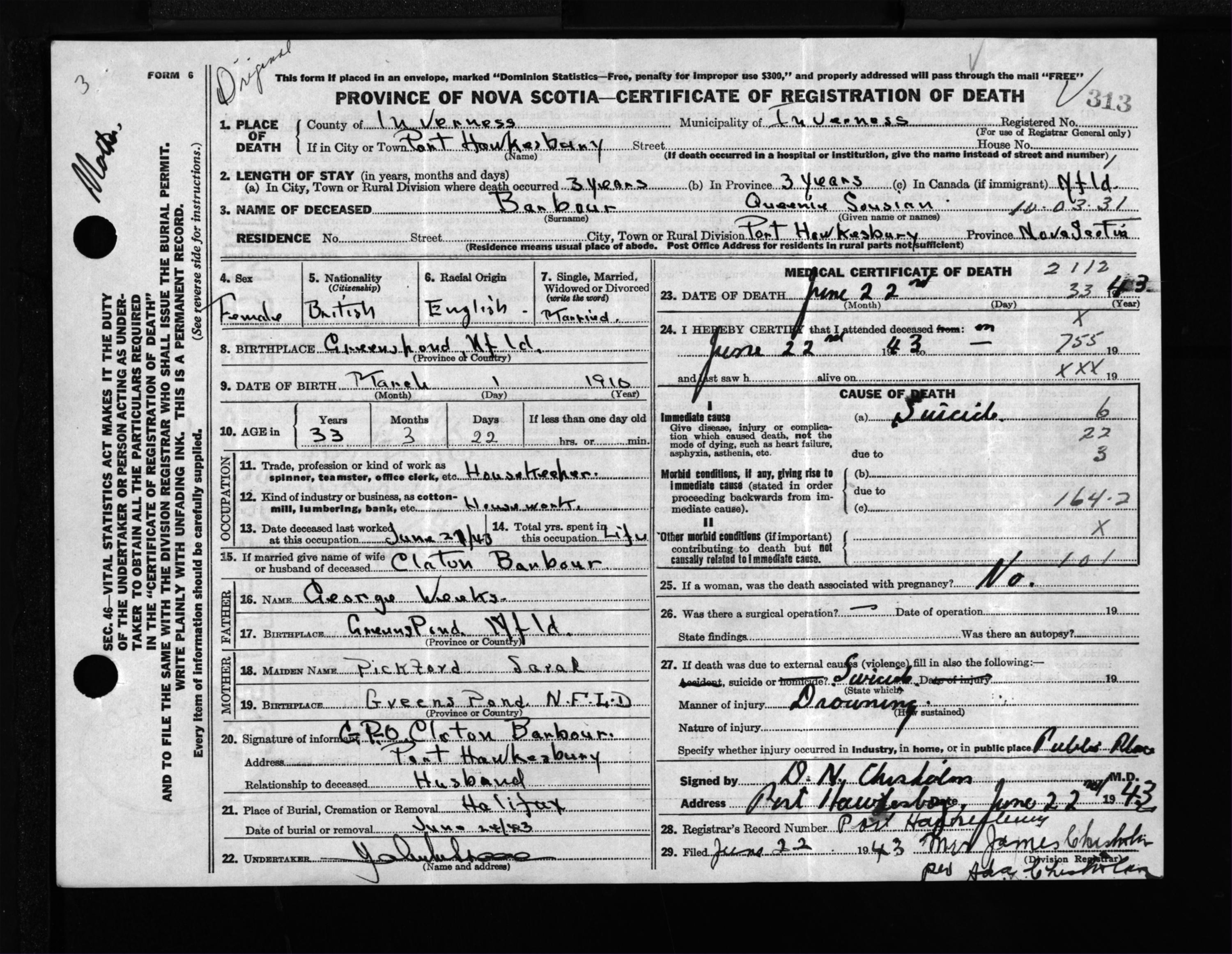 Female Death Registration: Year: 1943 file: 207 number: 313