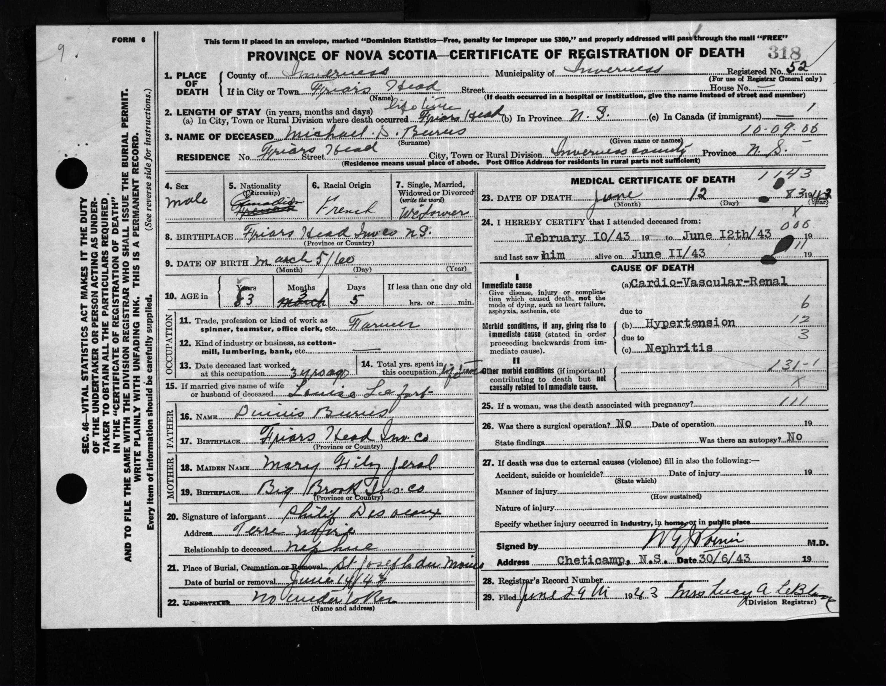 Male Death Registration: Year: 1943 file: 207 number: 318