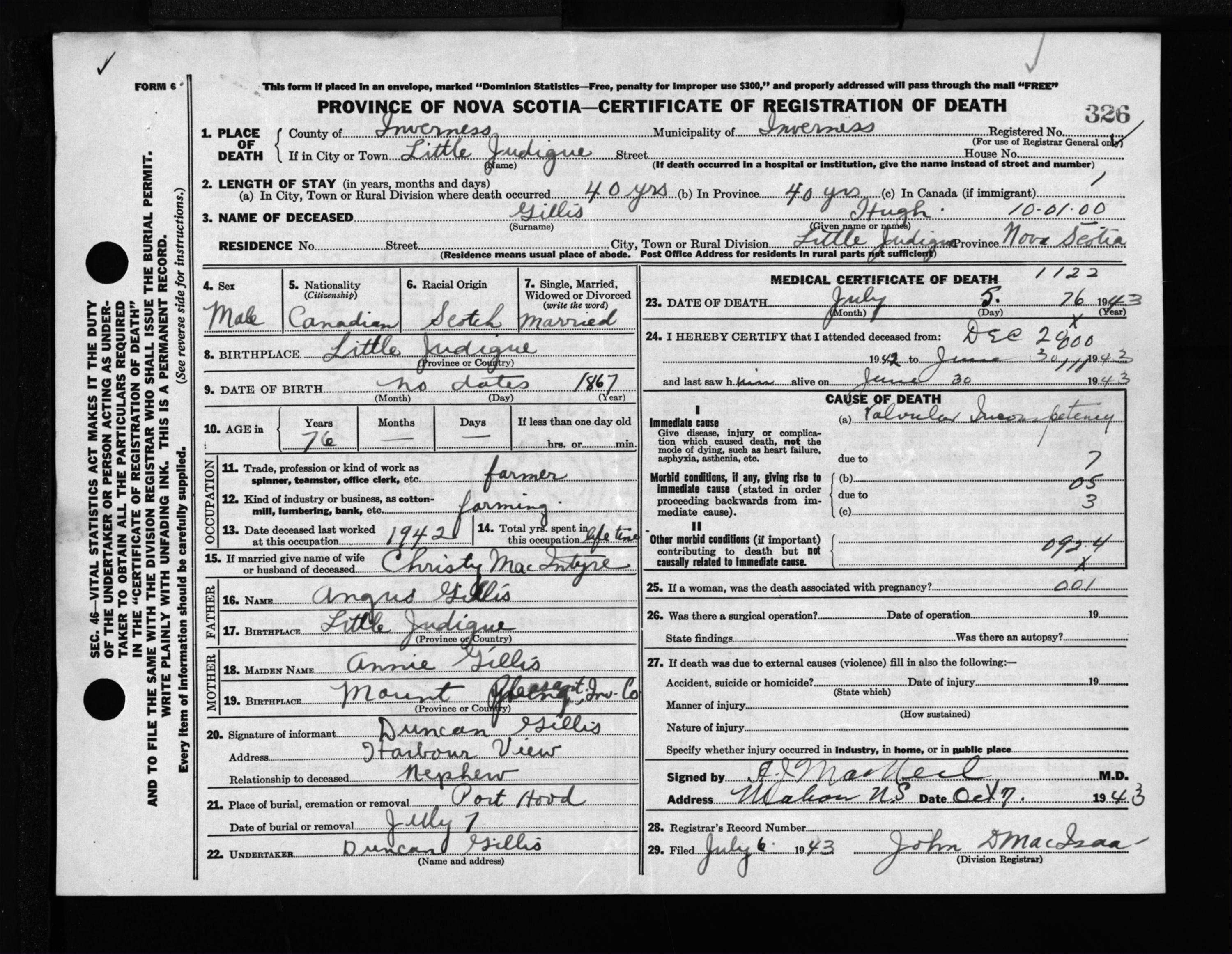 Male Death Registration: Year: 1943 file: 207 number: 326