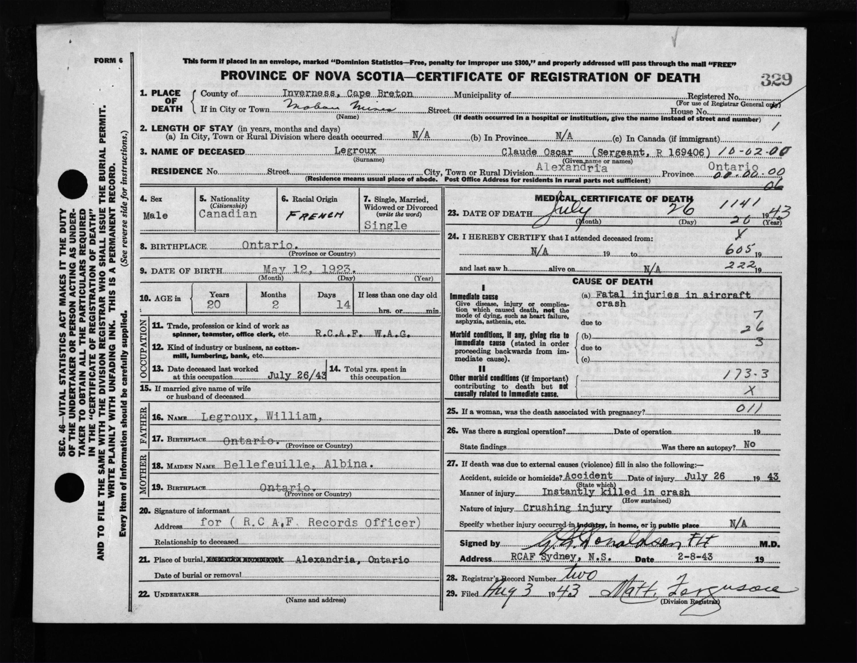 Male Death Registration: Year: 1943 file: 207 number: 329
