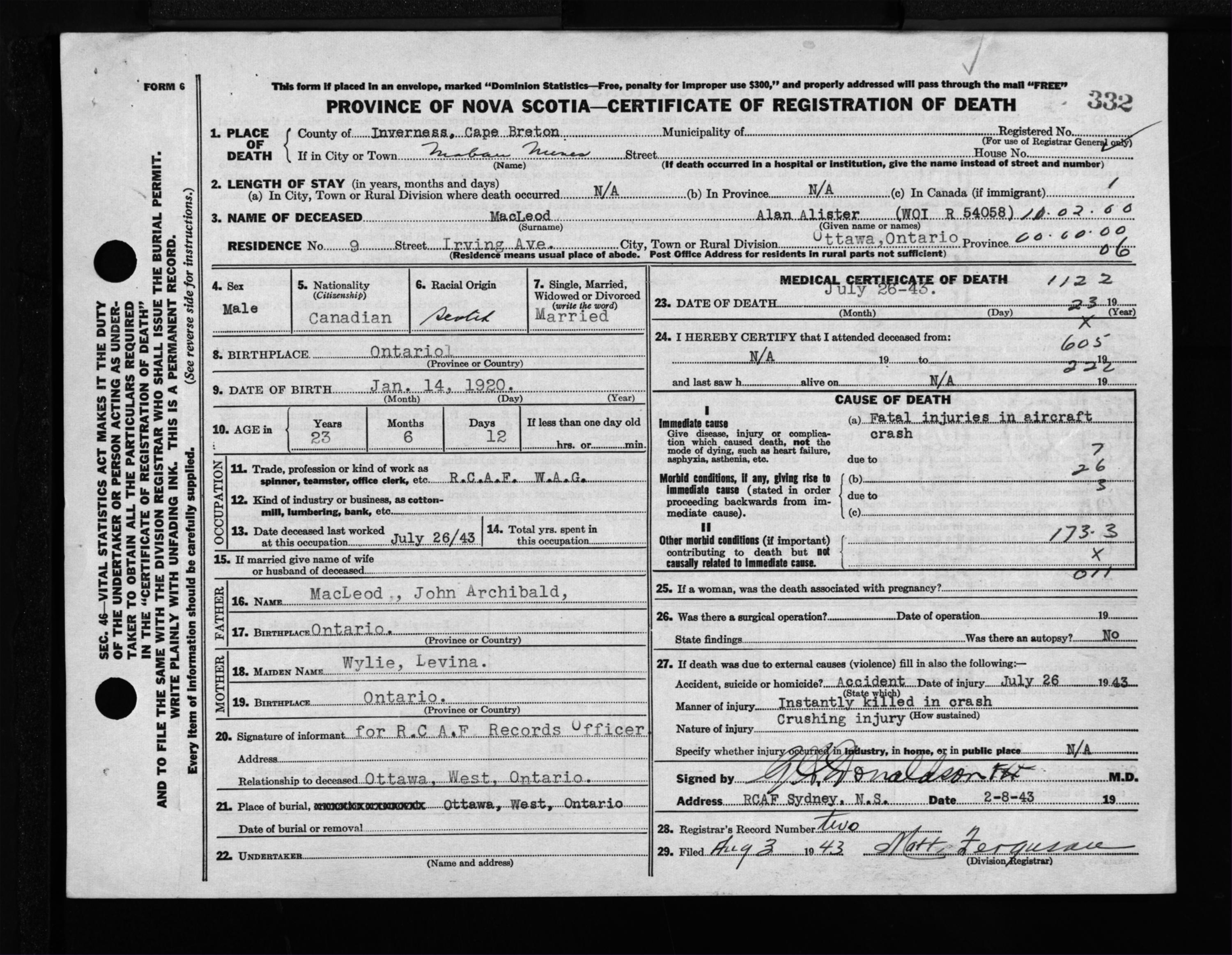 Male Death Registration: Year: 1943 file: 207 number: 332
